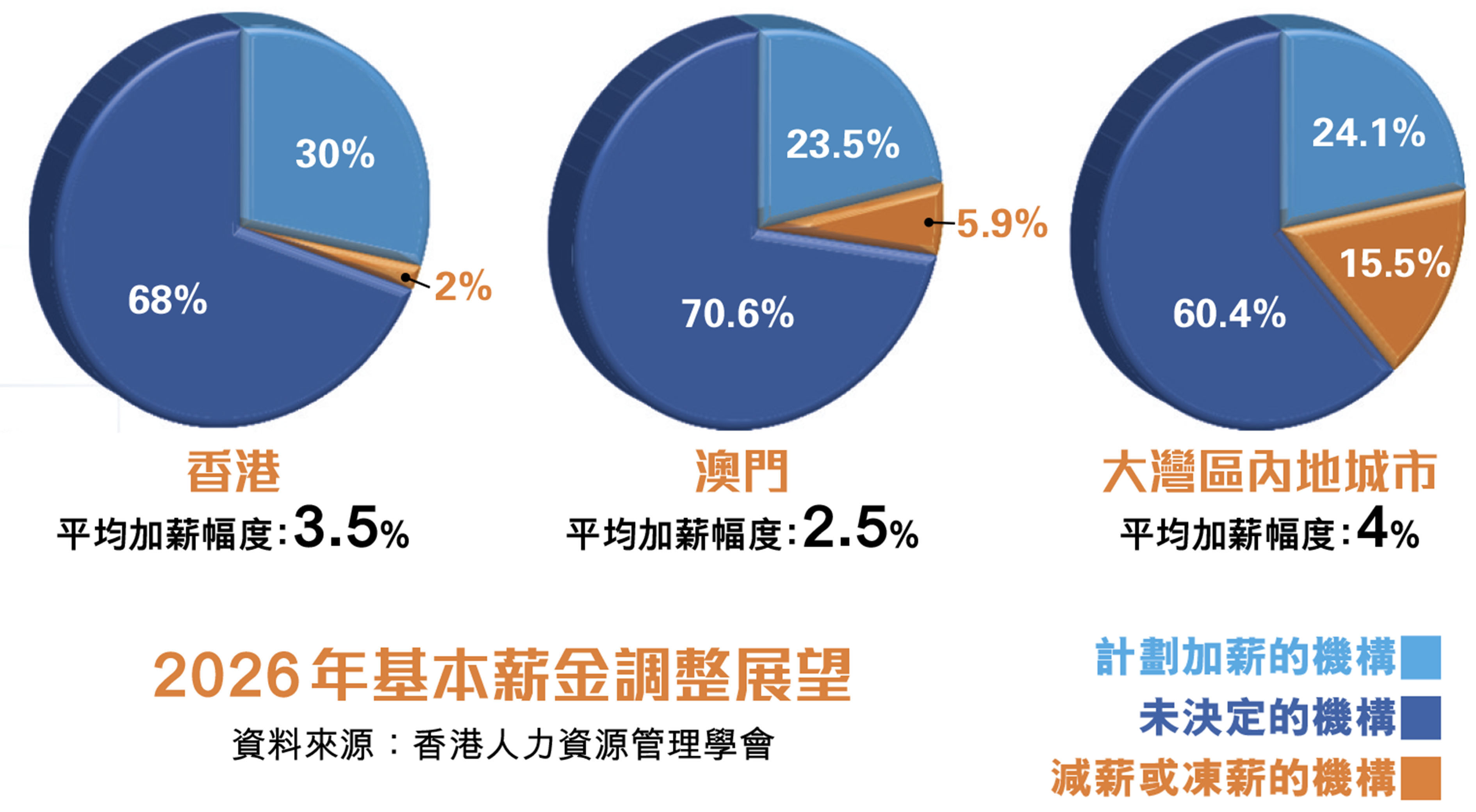 展望來年,分別有30%、23.5%及24.1%香港、澳門及大灣區內地城市的受訪機構打算為僱員加薪,灣區內地城市的平均加幅最高達4%,香港則為3.5%,澳門2.5%。孔于人指出,根據近期各種市場因素及分析,香港經濟已出現改善,預計機構明年將普遍提高加薪幅度以吸引及挽留人才,迎接經濟轉型。他建議機構需及時根據市場動態作出應對與加薪等部署,同時透過加強員工培訓、完善福利及打造家庭友善工作環境等措施,進一步強化人才留任與人力規劃。