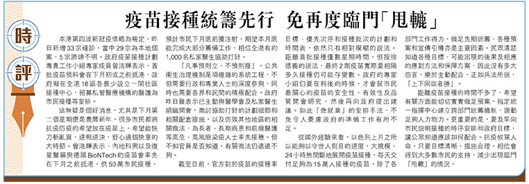 距離疫苗接種的時間不多了,希望有關方面能切切實實做足預案,指定統一指揮中心建立跨部門統籌機制,調動足夠人力物力。更重要的是,要及早向市民說明接種的時序安排和政府目標,讓公眾知道應該如何配合。抗疫攸關人命,只要目標清晰,措施合理,相信會得到大多數市民的支持,減少出現臨門「甩轆」的情況。