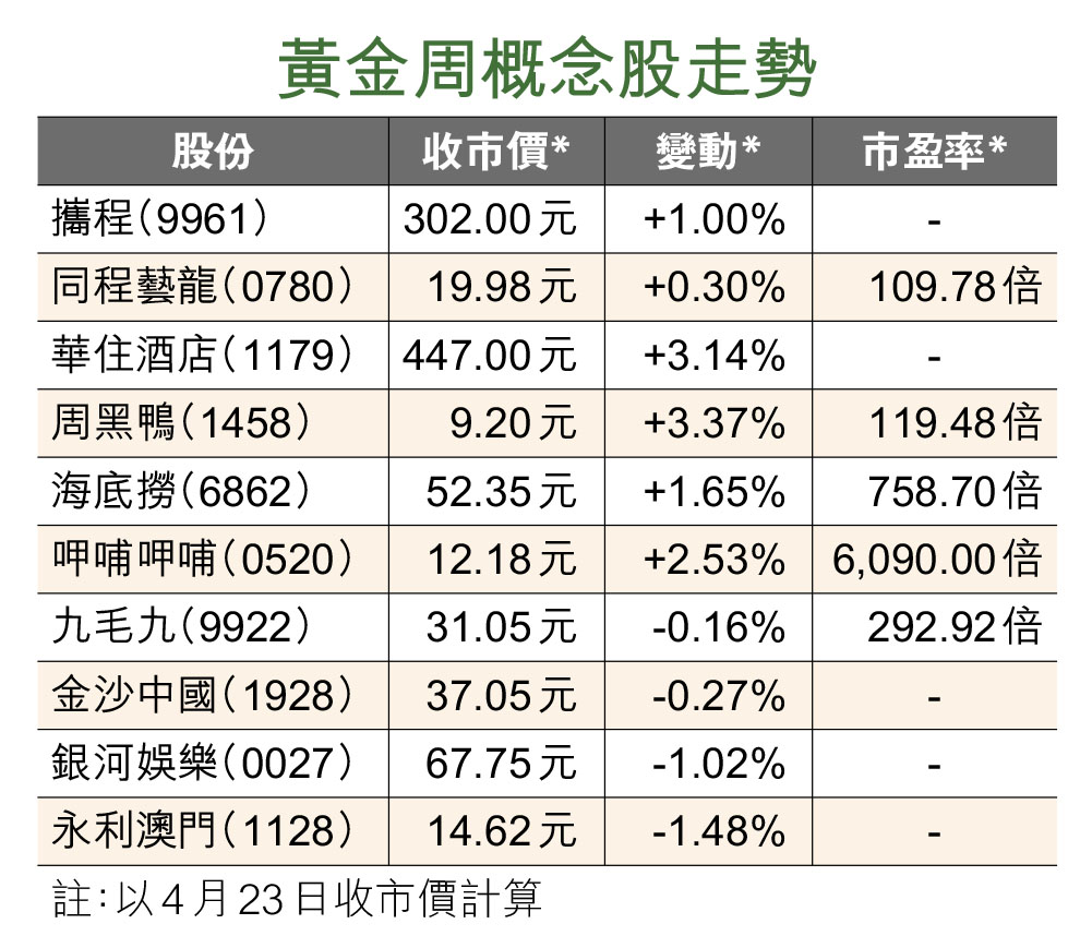 不過,他認為,即使今次五一黃金周的預熱情況,被旅遊及酒店業界冠以「史上最熱五一黃金周」 稱號,令市場聯想到消費概念抬頭,惟每年黃金周無論是五一,還是十一,炒風都是短暫且來去匆匆,比較似是市況無聊時的借題發揮,多於是宏觀基本因素上的考量。
