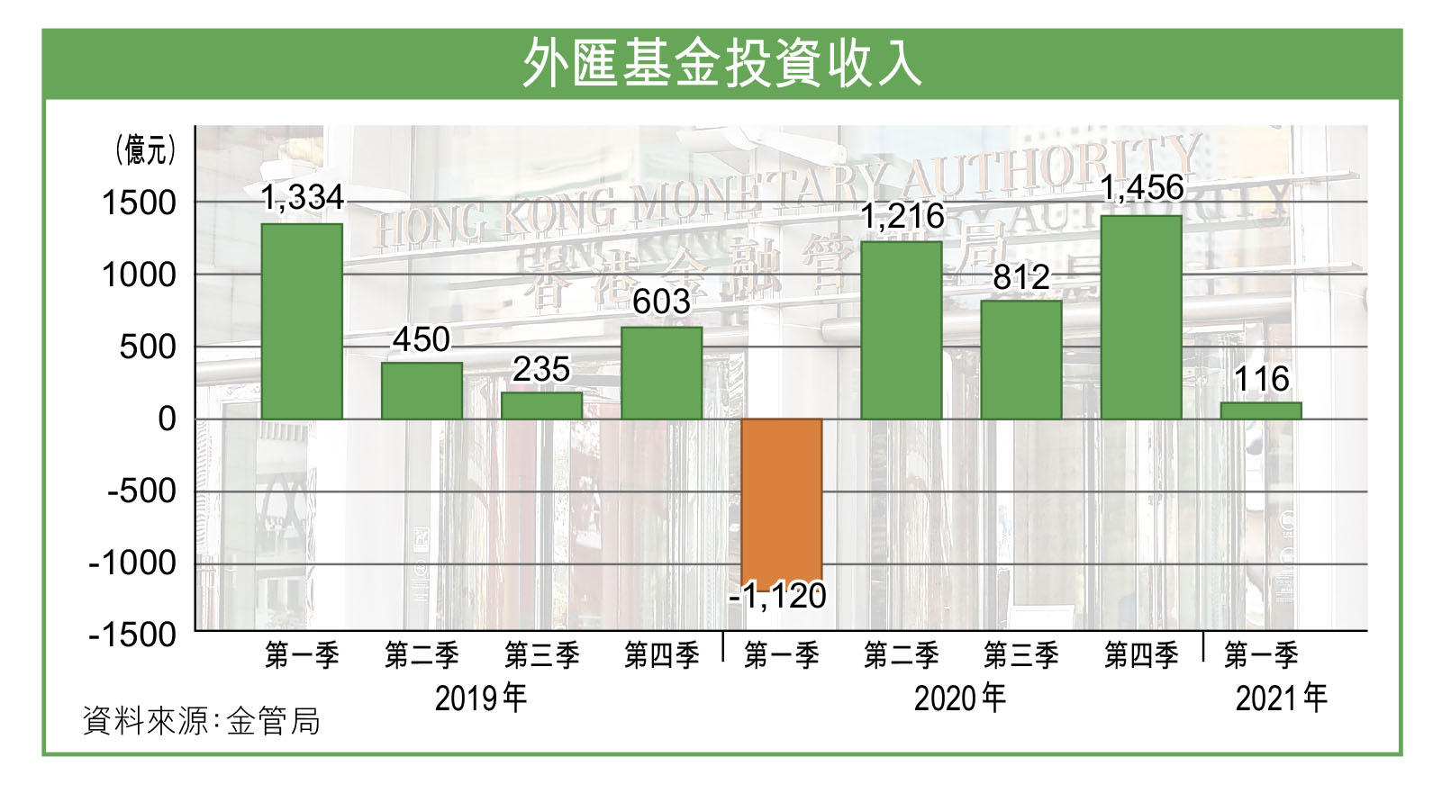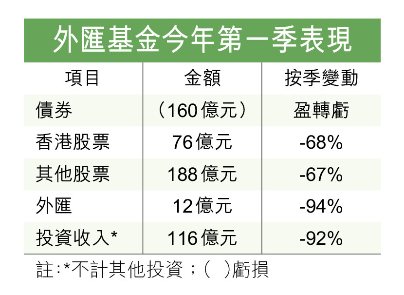 美國10年期債息由去年最低約0.5厘至0.6厘,抽升至今年首季最高約1.7厘,導致金融市場大幅波動,外匯基金期內債券投資更由盈轉蝕160億元,各類別投資收益亦大跌,其中香港股票投資僅賺76億元,按季減少68%,其他股票賺188億元,跌67%。