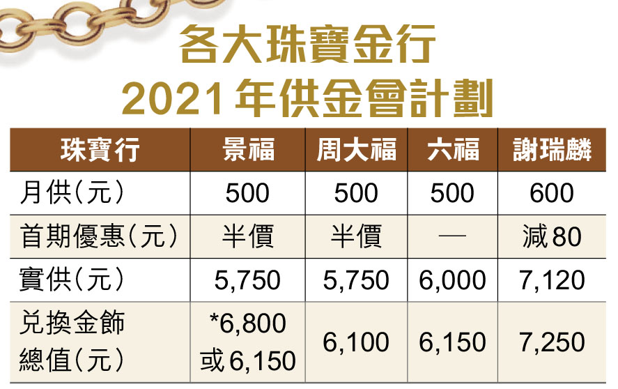 所謂供金會,是以月供黃金的形式供款,在一年後,以優惠價兌換金飾,加上不少珠寶金行都會提供首期供款減半優惠及贈品,確實有着數。至於供金會的金額可謂豐儉由人,由100元、300元、500元以至1,000元或以上都有,供滿一年後可以取得比供額價值高少少的金飾。