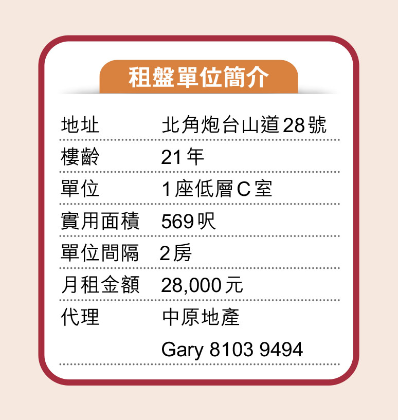 是次放租的單位為1座低層C單位,實用面積569呎,兩房設計,月租叫價28,000元,實呎租金叫價49元,最適合小家庭。