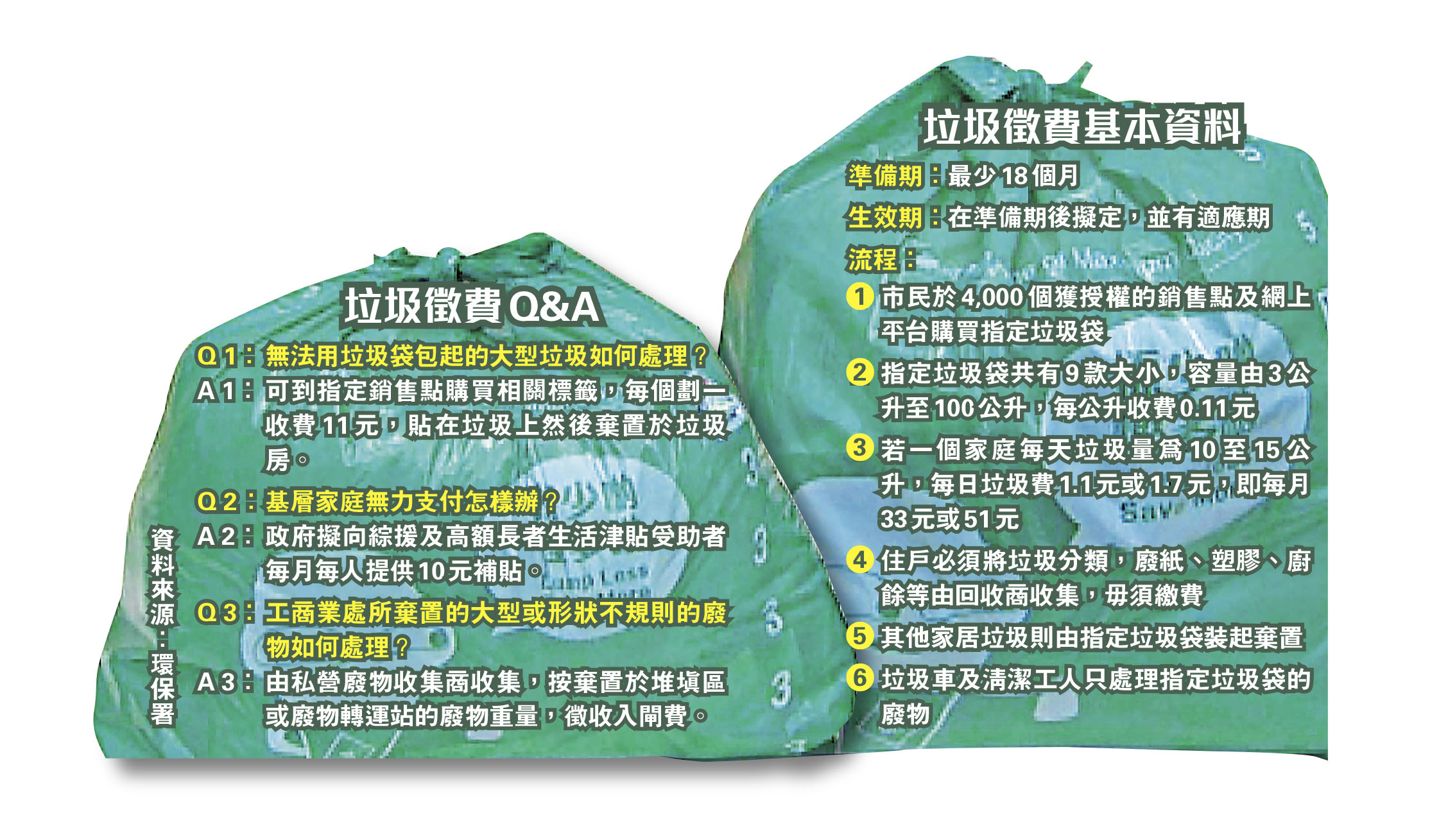 立法會昨日三讀通過《2018年廢物處置(都市固體廢物收費)(修訂)條例草案》,政府將設至少18個月準備期,之後視乎社會經濟情況,擬定正式實施日期。生效後,全港市民必須購買指定垃圾袋包裹垃圾,政府垃圾車只處理指定垃圾袋的廢物,以三人家庭、每天棄置10至15公升垃圾為例,每月需付33或51元,綜援戶將獲津貼(見Q&A)。然而執法是垃圾徵費最大難題,有曾參與垃圾徵費試點計劃的屋苑相信,個別住戶將拒買指定垃圾袋,屆時管理處必須掏腰包買指定垃圾袋包裹亂棄的垃圾,成本更會轉嫁其他業主,令管理費上調5%至6%。