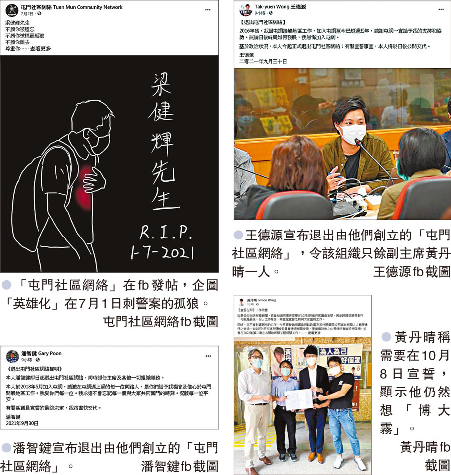 在特區政府正式公布有關消息前,潘智鍵和王德源在fb發帖,宣布退出「屯門社區網絡」,令該組織只餘副主席黃丹晴一人。儘管潘智鍵和王德源未有交代是否參與宣誓的意向,但兩人已經連續兩次未有參與屯門區議會會議。黃丹晴昨晚深夜在fb發帖,稱自己將需要在10月8日宣誓,故「正趕及製作『可能是最後一份』工作報告,希望在宣誓之前向大家匯報工作」云云,顯示他仍然想「博大霧」。