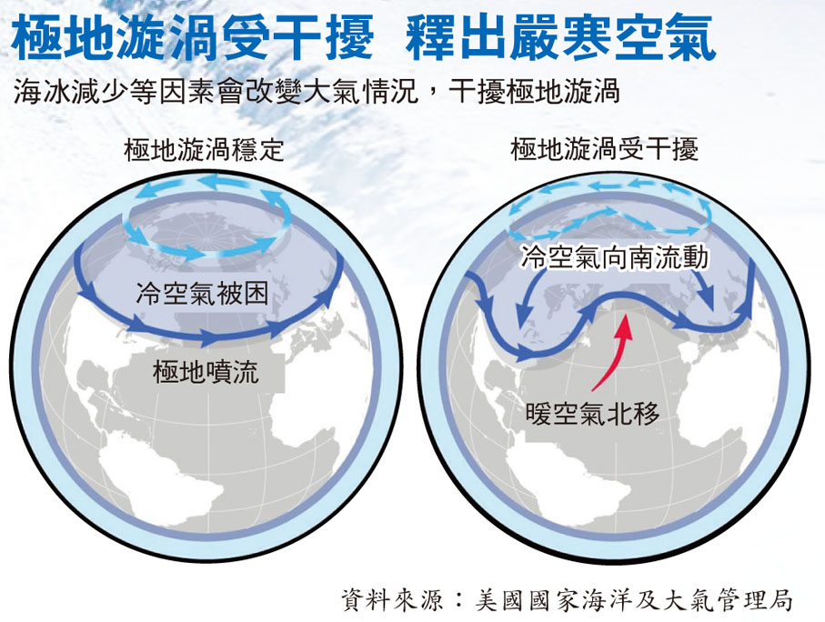此外,極地漩渦亦可能成為引發寒流的重要因素。北極在冬天有大量極寒冷空氣,一股被稱為極地漩渦的氣流一直環繞北極上空,將冷空氣困於北極。然而科學家近期發現北極海冰減少及平流層突然變暖,認為這兩個早期跡象,顯示極地漩渦轉弱令冷空氣南流的可能性增加。氣候預測機構Atmospheric G2的氣象學家克勞福德指出,平流層突然變暖會干擾極地漩渦,可帶來災難性後果,他指今年1月曾出現平流層突然變暖現象,最終令美國南部出現罕見寒潮,導致得州電網停運,至少210人死亡。