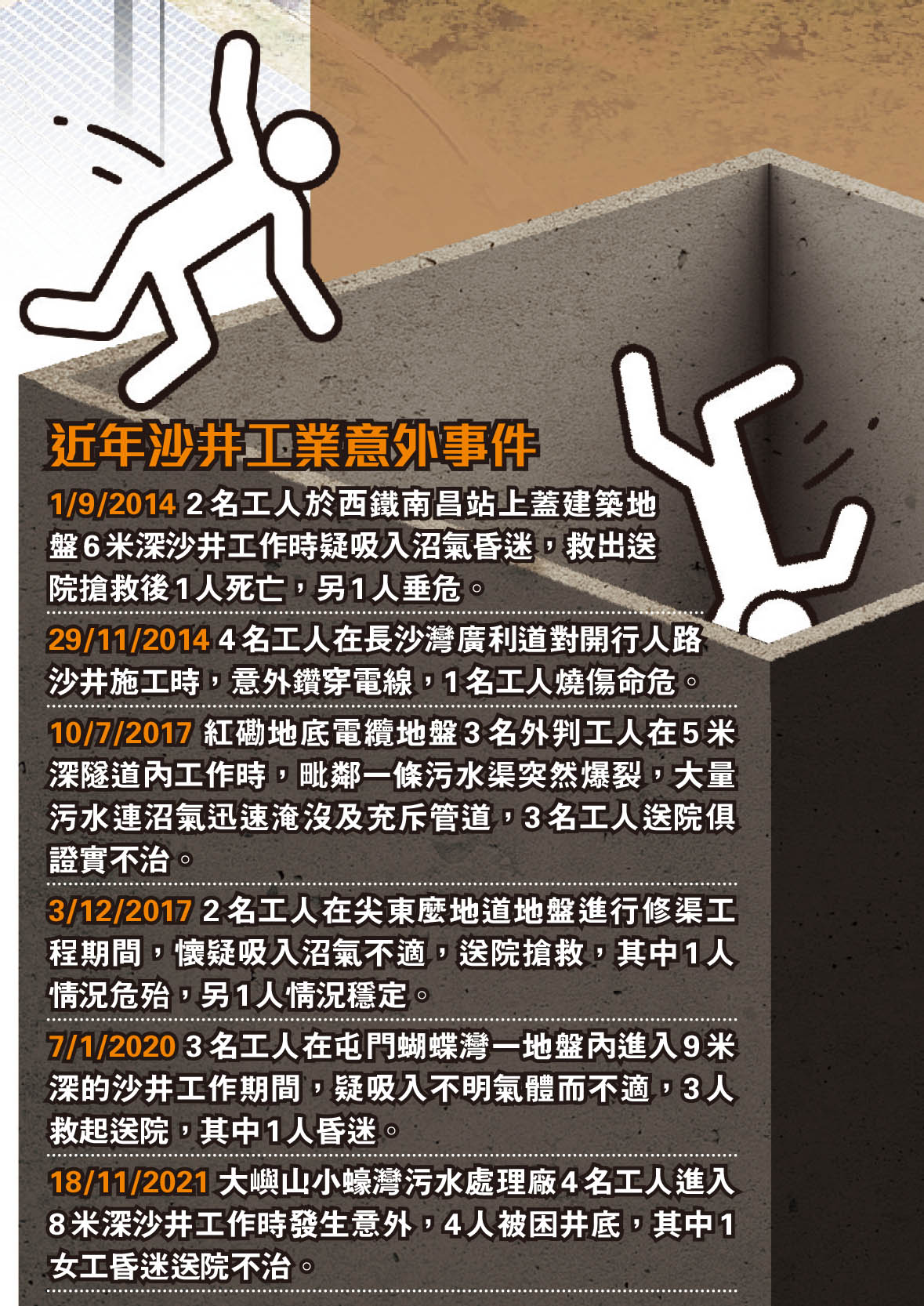 另據《職業安全及健康條例》(第509章)第7條,「處所佔用人須確保在該等處所受僱的人安全及健康」,工人落沙井工作而沒有做足安全措施,東主或承建商都要負上責任,一經定罪可判罰款20萬元和監禁1年。