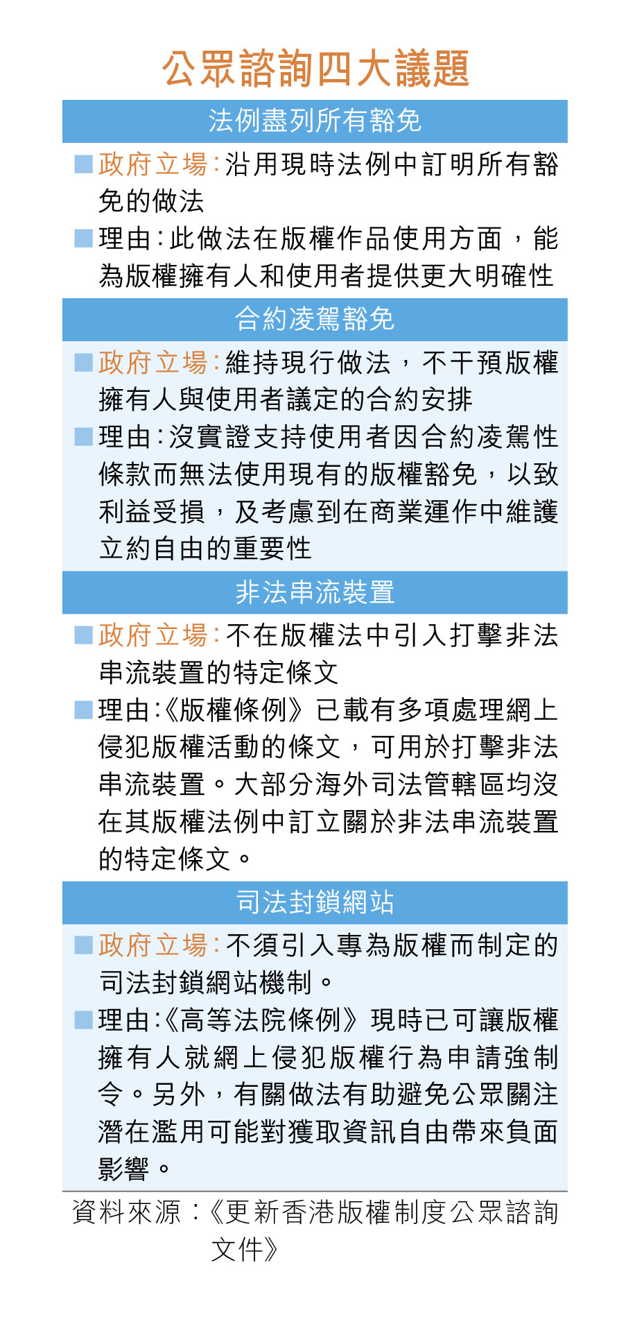 香港版權制度落後國際逾10年,特區政府重啟更新版權制度工作,昨日起就修訂《版權條例》展開為期3個月的公眾諮詢,並以2014年相關立法建議為基礎,提出五大範疇,包括建議豁免戲仿、諷刺、評論時事等目的而使用版權作品;引入科技中立專業傳播權的同時,對未授權人士向公眾傳播版權作品施加刑事制裁;並增訂「安全港」條文,鼓勵連線服務提供者與版權擁有人合作打擊網上盜版活動等。
