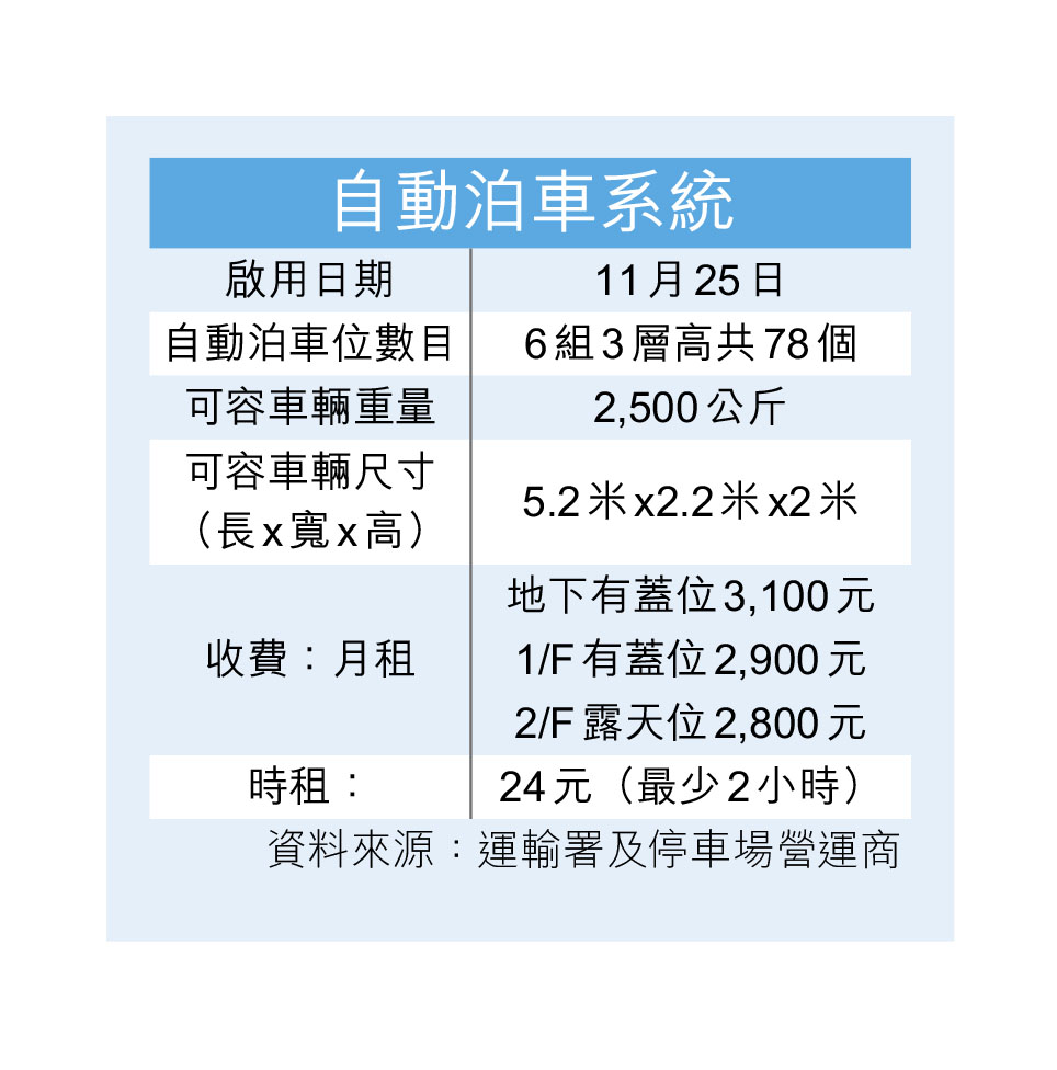 鄧錦輝表示,系統可容納車輛的重量上限為2,500公斤,尺寸上限為5.2米長、2.2米寬、2米高,全港99%私家車均適用,僅有少量車身特別長的車輛不合適。若系統發生故障,例如沒有電力供應,亦可改用人手操作,將車輛降回地面。而每個車位成本約數十萬元,即整套系統斥資逾千萬元,財務安排及價格均由營運商制定。
