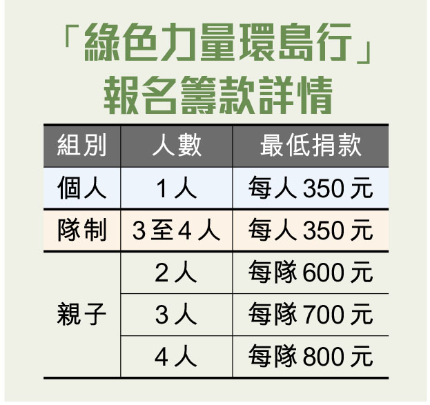 「綠色力量環島行」設個人、隊制及親子組,路程長度有10公里、25公里及50公里,參加者可按個人經驗及體力選擇適合的路程及分段進行,更有彈性安排時間享受遊港島徑的樂趣,只要籌募指定金額即可報名(見表)。參加者於活動期內上載所有行山紀錄,大會便能累積計算出最後成績。今屆每位參加者均可獲贈環島行紀念運動毛巾,成功完成指定里數者更可獲電子證書及由廢木升級再造的個人化獎牌。活動另設有7個企業盃賽,企業團隊可組隊挑戰,加強團隊合作。