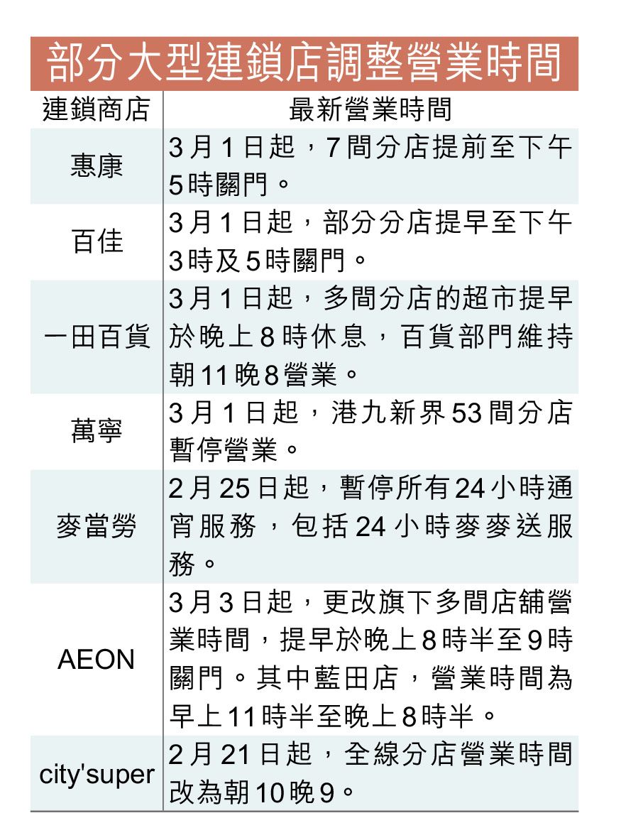 另外,連鎖超市百佳和惠康昨起亦縮減分店營業時間。其中12間百佳分店將提早至下午3時關門,包括柴灣興民邨、跑馬地成和道、油麻地渡船街、觀塘和樂邨、九龍灣九展、何文田半山壹號、紅磡國際都會、橫頭磡宏暉中心、葵涌象山邨、將軍澳維景灣畔、葵涌石籬邨及青衣城分店,另大部分分店營業時間提早至晚上8時至9時結束。惠康將調整320間分店營業時間,其中7間提早至下午5時關門。