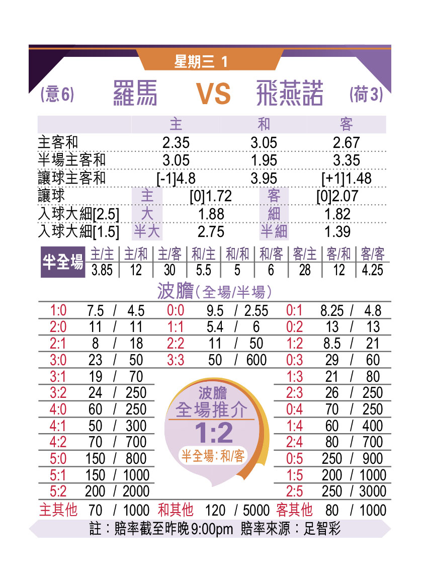 史上首屆歐協聯決賽今晚將在阿爾巴尼亞中立場爆發,羅馬對飛燕諾。由「寸王」摩連奴帶領的羅馬,之前兩次打入歐洲賽決賽均鎩羽而歸,縱然摩帥是盃賽專家,但在實力未算突出下,要在法定時間內贏波難度極高。反觀飛燕諾過去3次打入歐戰盃賽決賽全數封王,有捧盃命兼今屆賽事連續12場不敗,受讓下絕對抵博。「讓球主客和」[+1]客勝要捧。(now 643台周四 3:00am直播)
