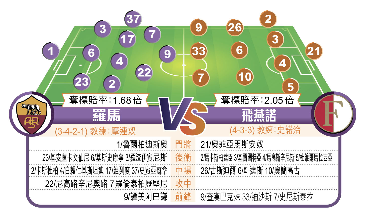 飛燕諾方面,過去3次在歐戰打入決賽,分別在1970年的歐冠盃、1974及2022年的歐協盃均全數奪標,命中率100%。事實上,球隊在主帥史諾治帶領下大踢進攻足球,表現出色,於今季荷甲亦拿下季軍,射手迪沙斯在今屆賽事已入10球,是賽事神射手,今場備受期待。雖說飛燕諾在荷甲煞科戰不敵川迪,各項賽事連續11場不敗告終,但留力今場用意明顯。再考慮他們自今屆歐協聯分組賽開始,已經連續12場不敗,今場當然無懼羅馬,可坐和望贏。