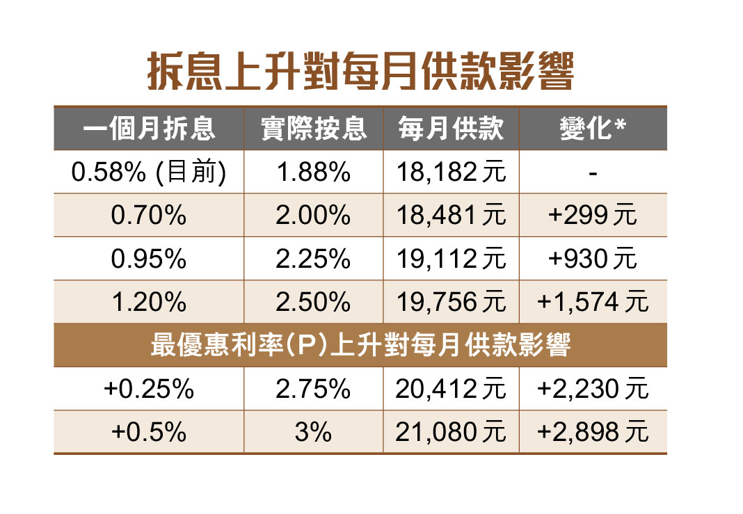 美國聯儲局大幅加息四分三厘,加幅是27年半以來最大。香港金管局因應美國加息,將本港基本利率上調至2厘。隨着加息預期升溫,近日本港銀行同業拆息(HIBOR)上升速度加快,市場主流的拆息按揭(H按)成本亦上升。分析料一個月HIBOR月底將見0.8厘,第三季見1.8厘,H按息將觸及2.5厘的封頂位。屆時借500萬元月供將增至19,756元,比昨日多1,574元,增幅達8.7%。