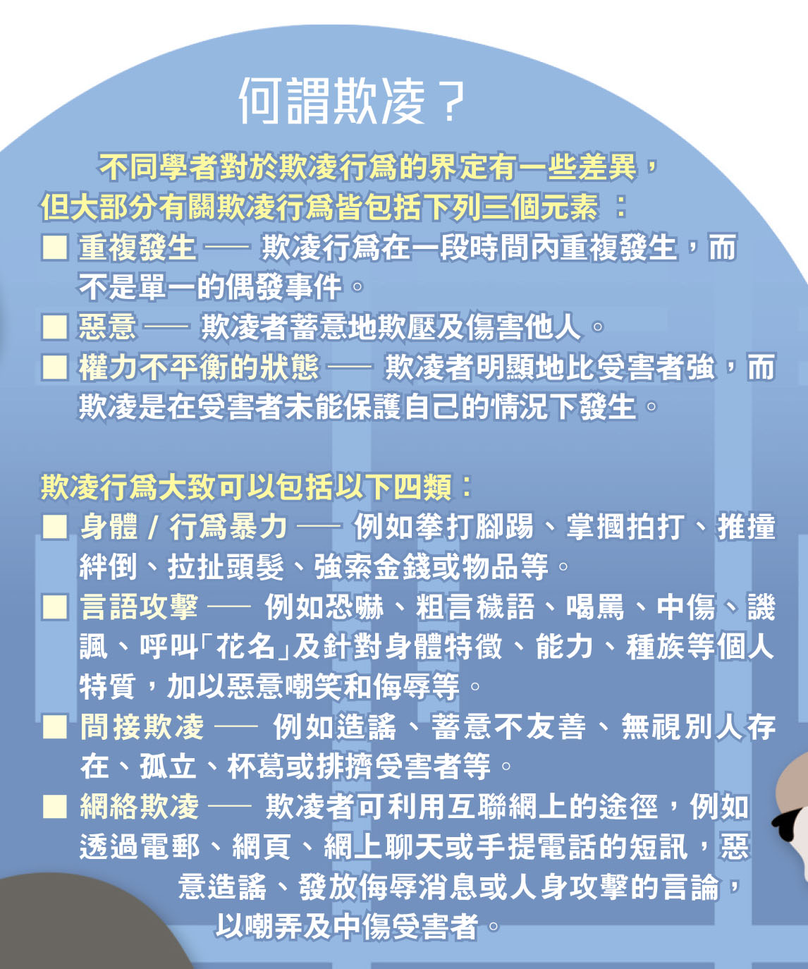 香港城市大學人文社會科學院的學者曾經指出,學童欺凌行為是香港現今其中一個最嚴重卻被忽略的問題。要界定何謂「欺凌」存在困難,城大人文社會科學院犯罪學專家黃成榮教授將「欺凌」定義為「處於強勢的人意圖傷害受害者,而多番作出攻擊行為」。