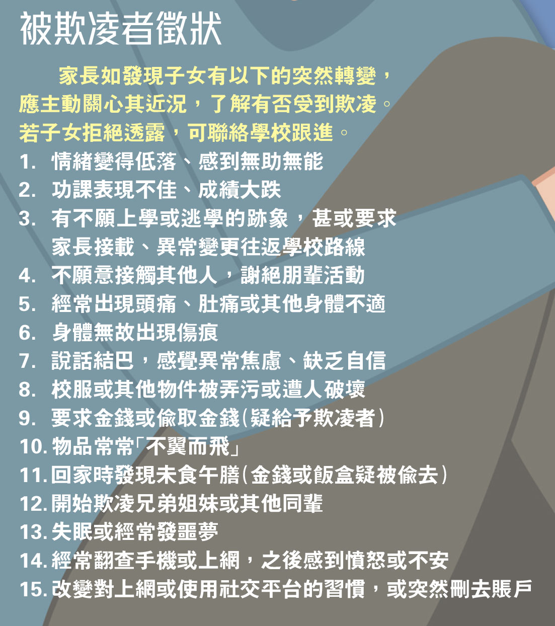 與此同時,家長亦應留意子女有否突然轉變,一旦不幸發現子女受到欺凌,應盡快向學校匯報及保持聯繫,詳細了解孩子被欺凌的過程,並可在老師和社工的協助下,與欺凌者的家長溝通,共同解決問題。平時亦可透過家長教師會,加深了解子女的校園生活,鼓勵子女與不同的人相處,提升社交能力,學習如何保護自己。若發現子女性格較怕事或被動,應鼓勵他們參與社交活動。倘從校方得知子女有欺凌行為,切勿以打罵形式懲罰他們,應找出其動機,加以輔導,如有需要可尋求專業人士的幫助。家長需明白自己是子女的榜樣,與子女建立良好的溝通和信任關係,令子女明白他們是幫到自己的成年人。