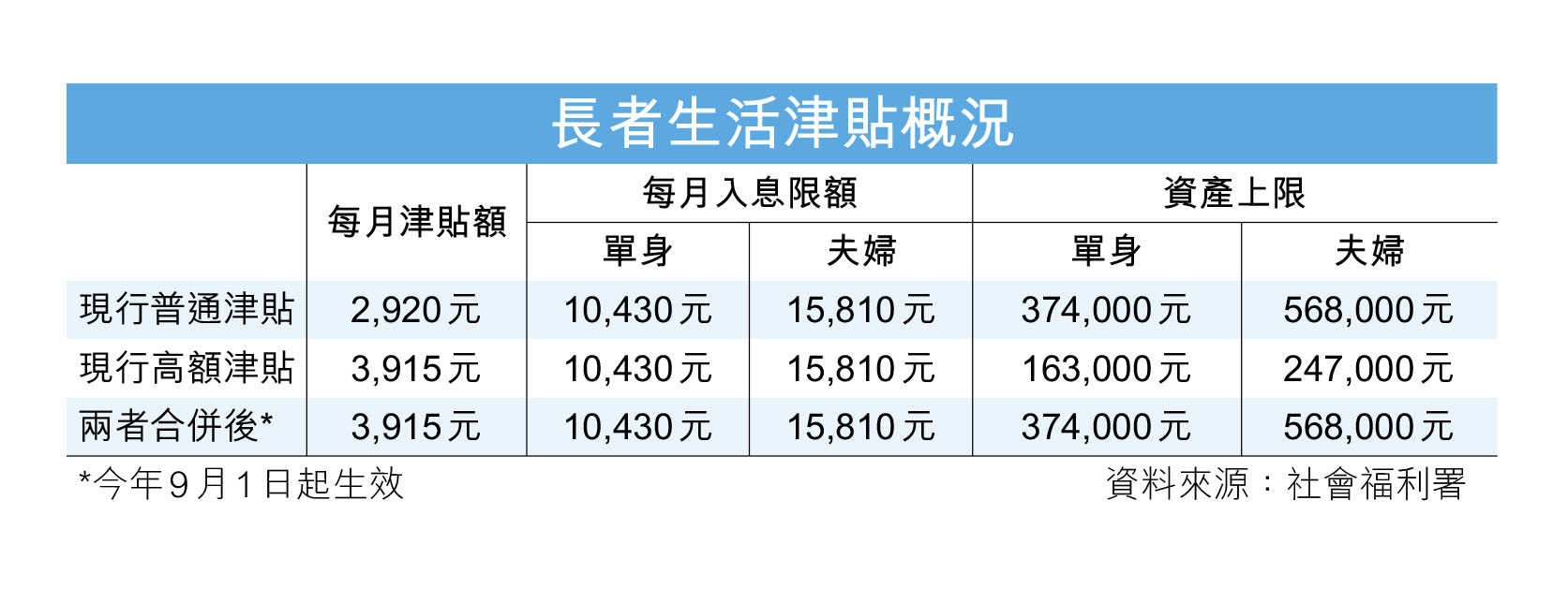 現時普通津貼及高額津貼分別為每月2,920元及3,915元,約5萬名正領取普通津貼的長者將在合併措施實施後每月額外獲發995元。合併後,申領人的每月入息限額維持不變,資產上限則劃一至現時較寬鬆的普通津貼標準。凡於合併前已正在領取普通津貼的長者,無須提交任何申請,9月起自動獲發較高額的津貼,新申領而合資格的長者也將領取較高額的津貼。