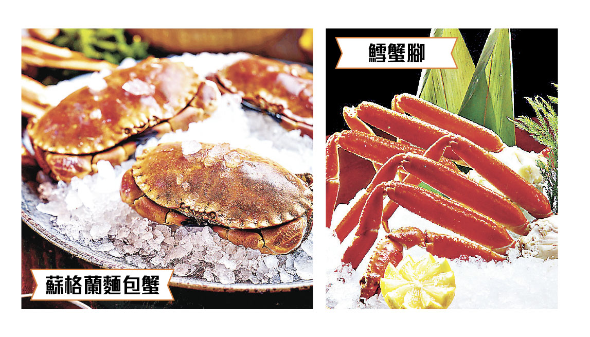 蟹饌頭盤精選開胃蟹肉飛魚籽沙律、泰式蟹肉青木瓜沙律、暖暖的蟹肉濃湯及蟹肉周打湯。接着可以冰凍海鮮觸動感官味蕾,包括加拿大松葉蟹腳及蘇格蘭麵包蟹,其他時令海鮮還有新西蘭青口、越南大蝦、小龍蝦及餐廳的招牌無限量凍波士頓龍蝦等。