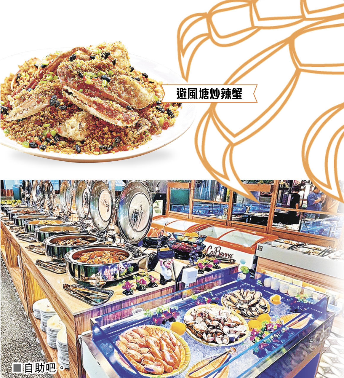 日式美食方面,有軟殼蟹青瓜卷及蟹肉蟹膏軍艦壽司,而天婦羅區更供應酥脆多汁的即炸軟殼蟹。多款以蟹入饌的熱食及主菜,包括蒜香撲鼻的港式避風塘炒肉蟹、香辣惹味的星洲胡椒肉蟹、鑊氣十足的蟹肉蛋白炒飯、美味的蟹肉扒西蘭花及從開放式廚房烤爐新鮮即焗的蟹肉番茄羅勒薄餅。另更有廚師在巨型巴馬臣芝士輪上即炒蟹肉蟹皇意大利飯,巴馬臣芝士的淡淡堅果香氣更令螃蟹的鮮味提升不少。