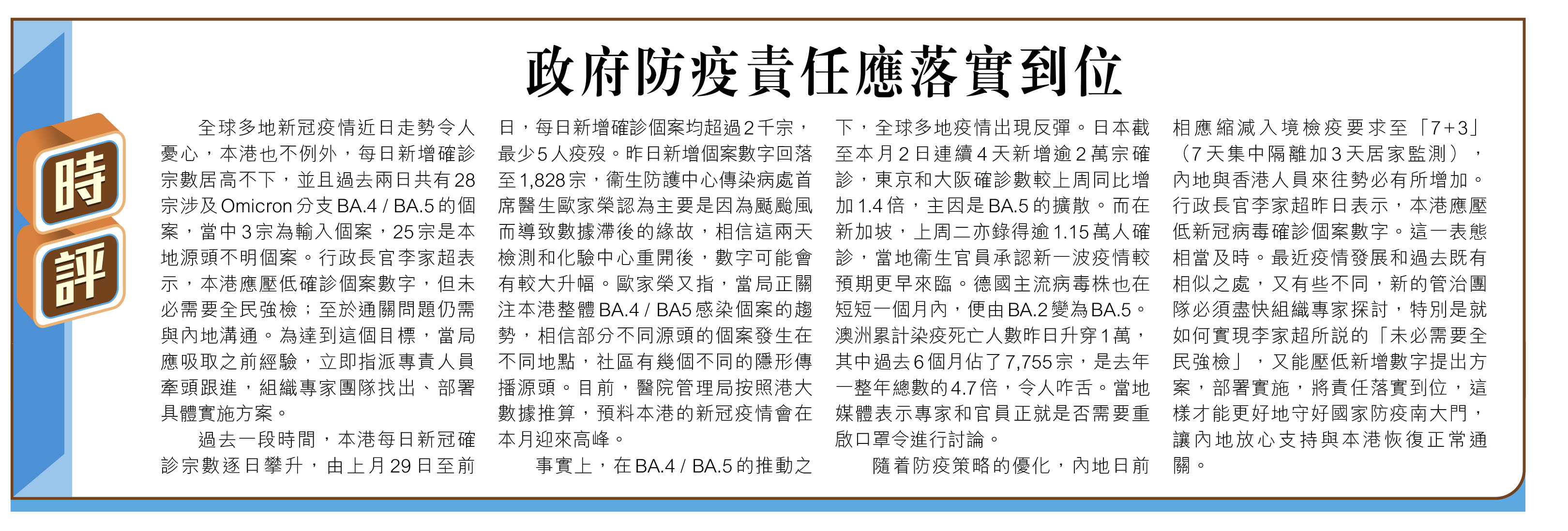 全球多地新冠疫情近日走勢令人憂心,本港也不例外,每日新增確診宗數居高不下,並且過去兩日共有28宗涉及Omicron分支BA.4 / BA.5的個案,當中3宗為輸入個案,25宗是本地源頭不明個案。行政長官李家超表示,本港應壓低確診個案數字,但未必需要全民強檢;至於通關問題仍需與內地溝通。為達到這個目標,當局應吸取之前經驗,立即指派專責人員牽頭跟進,組織專家團隊找出、部署具體實施方案。