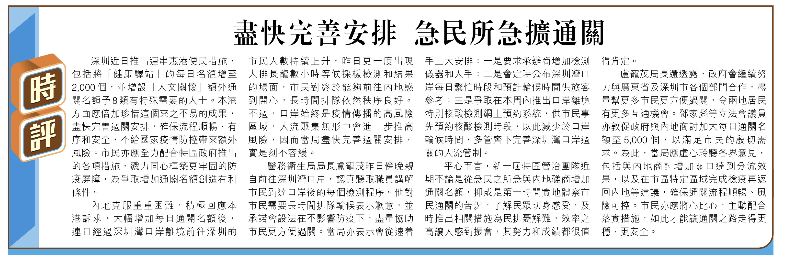 【時評】盡快完善安排 急民所急擴通關