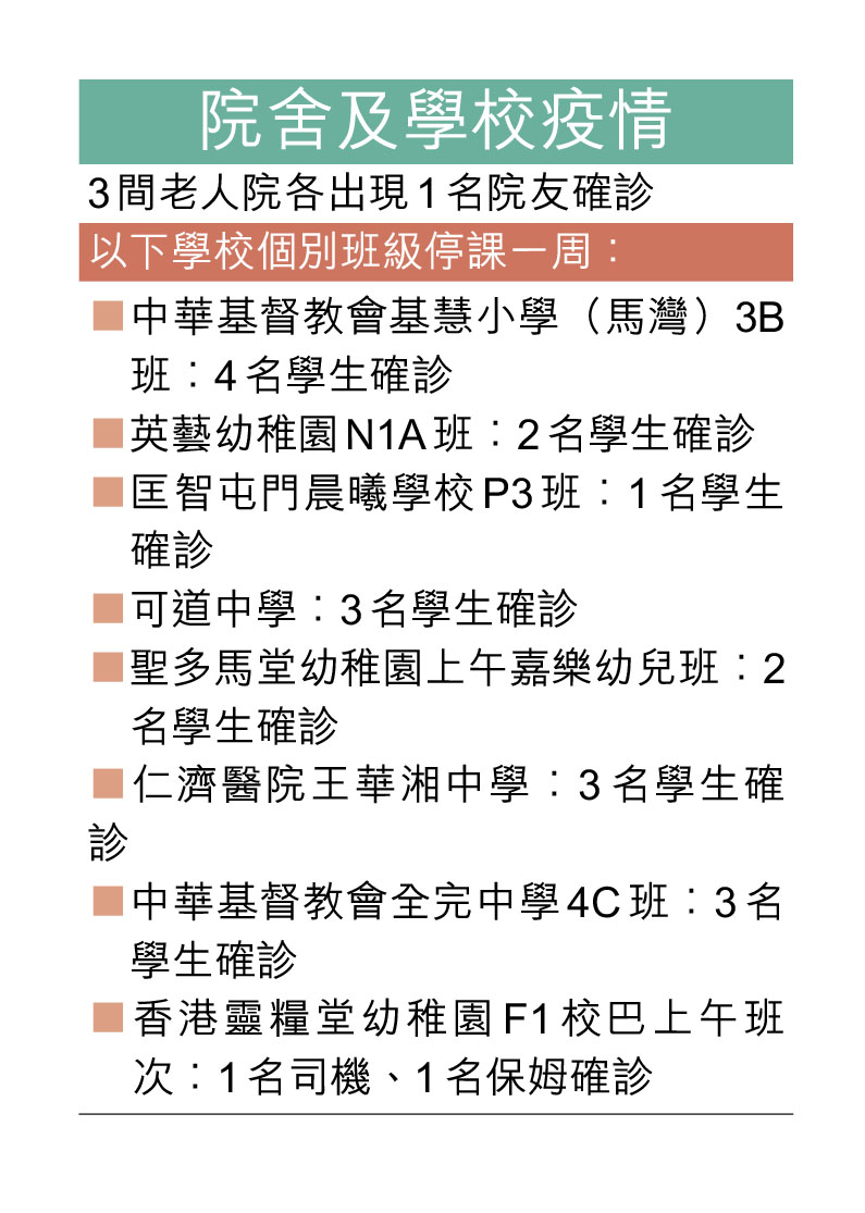 香港昨日新增確診3,256宗,再多4人離世,均為90歲以上長者,其中一人相信是二次感染。學校呈報個案亦持續增加,昨日呈報個案498宗,新增8間學校有班別須停課一周,包括一幼稚園校巴出現司機和保姆確診,另有2間已有個案的學校,再有新班別需停課。衞生防護中心傳染病處主任張竹君表示,香港疫情仍有機會上升,目前沒條件放寬社交距離,呼籲市民戴口罩做好防疫措施。