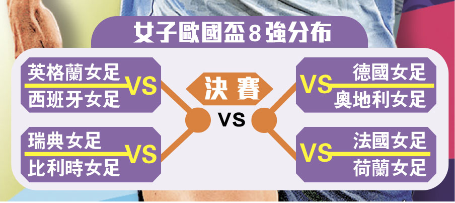 女子歐國盃眨眼間已戰至8強階段,首場半準決賽會於白禮頓的美國運通社區球場開打,由東道主英格蘭女足對西班牙女足。被視為奪標大熱的「女獅兵團」,在分組賽表現完美3戰全勝,超強火力震撼球壇,反觀「女狂牛」在兩大巨星缺陣下,戰力大減,今場根本無力招架,主勝必捧。(UEFA.tv周四3:00am直播)