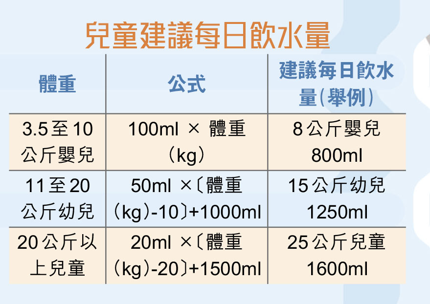 兒童因為體表面積佔身體比例較大,且新陳代謝效率比大人高,體內產熱較快,比成年人更容易中暑。不過,一歲前的嬰兒由於腎臟尚未發育完全,而且平常餵食的母乳或配方奶已有充足水分,幾乎不用額外補充水分。在一歲以後隨年紀增長,腸胃道、腎臟發育愈來愈成熟,可以隨體重增加每日飲水量。如孩子不愛喝水,也可從湯及水果、牛奶等飲食中攝取,保持應有水分。