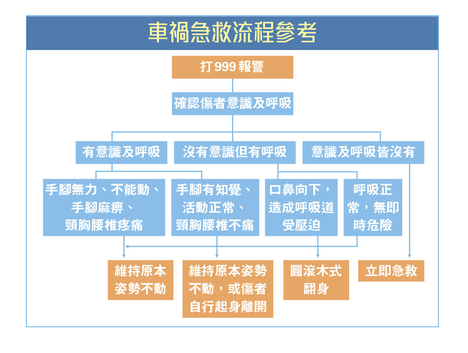 救人期間切忌讓傷者的頸部移動,因像是車禍、墜樓、運動傷害等經過高速撞擊的意外後,無論是突然加速或瞬間停頓,都有可能造成頸椎傷害。人體頸椎共有7節緊扣相連,頸椎後方則是脊髓,一路延伸到胸椎、腰椎,屬於中樞神經。假使頸椎、胸椎或腰椎骨折、斷裂或錯位,首先可能感到麻痹無力;若再進一步移動而壓迫脊髓,便可能造成全身或半身癱瘓,甚至影響呼吸肌,無法呼吸而導致死亡。專家提醒,應先從正面呼叫傷者確保是否清醒,再進一步觀察對方的四肢及頸椎、胸椎、腰椎情況,來判斷是否維持原狀或適時正確移動。這時可請傷者郁動手指、腳趾,如果沒有知覺又不能動,表示頸椎有可能受傷,如果下半身毫無知覺又不能動,表示胸、腰椎可能受傷,這時應讓傷者躺平,身體不可彎曲。