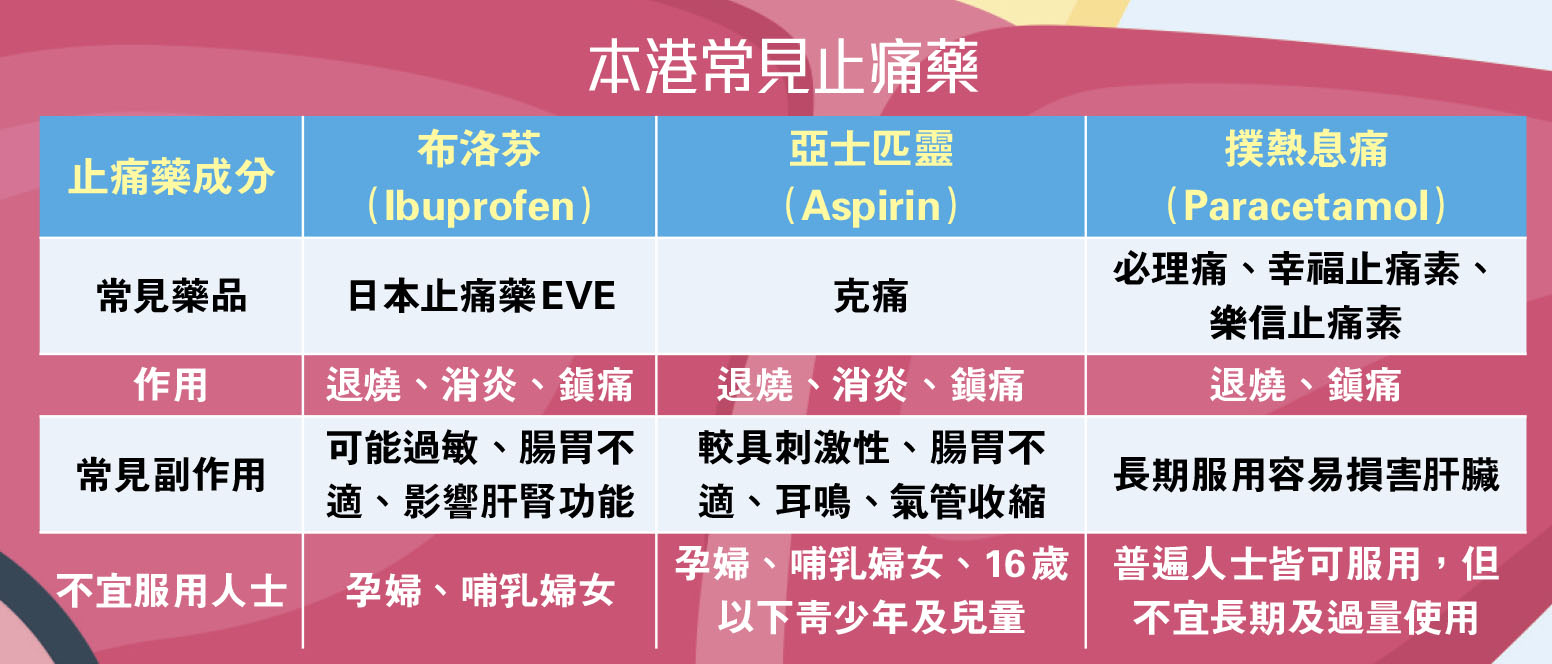 根據衞生署資料顯示,現時本港常見的止痛藥分為非鴉片類止痛藥及鴉片類止痛藥,前者包括撲熱息痛(Paracetamol)、亞士匹靈(Aspirin)及其他非類固醇消炎止痛藥(NSAIDs),當中非類固醇消炎止痛藥常見的布洛芬(Ibuprofen)藥性較強,除可解熱、止痛及消炎外,常用於風濕性關節炎、痛風症、神經性肌肉失調症、軟組織發炎及普通痛症如頭痛、牙痛及經痛等。非類固醇消炎止痛藥副作用相對較多,包括引起腸胃不適、頭暈、腹瀉,甚至可引致胃出血。由於經肝臟及腎臟代謝,影響腎臟血流,對腎臟造成傷害。