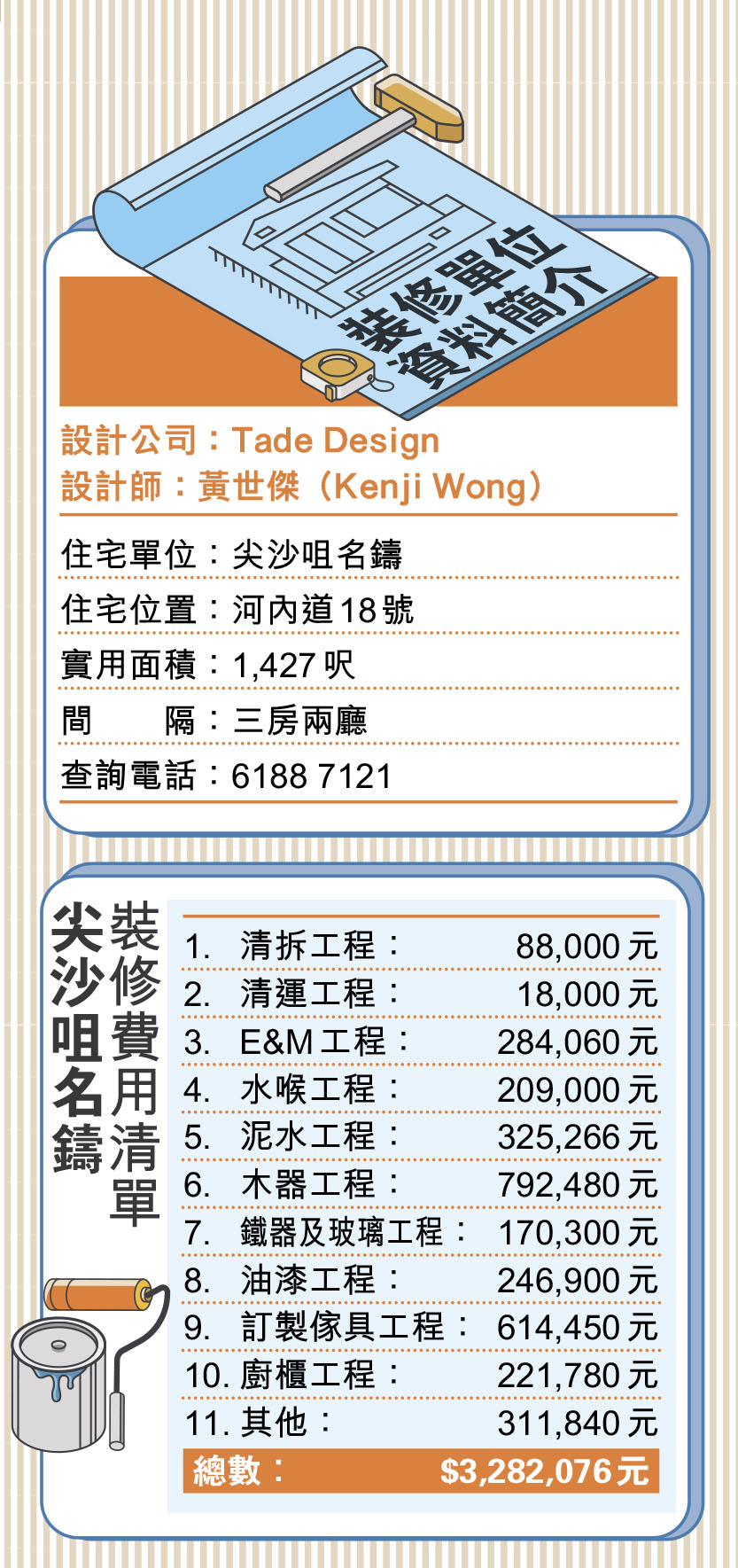 本單位的設計概念主要以簡單和增強不同區域的互動為出發點,所以設計師黃世傑(Kenji Wong)在重組公寓時非常注重靈活度。為實現此目的,設計時沒有選用實牆,主要以玻璃牆、趟摺門、間牆櫃分隔空間。