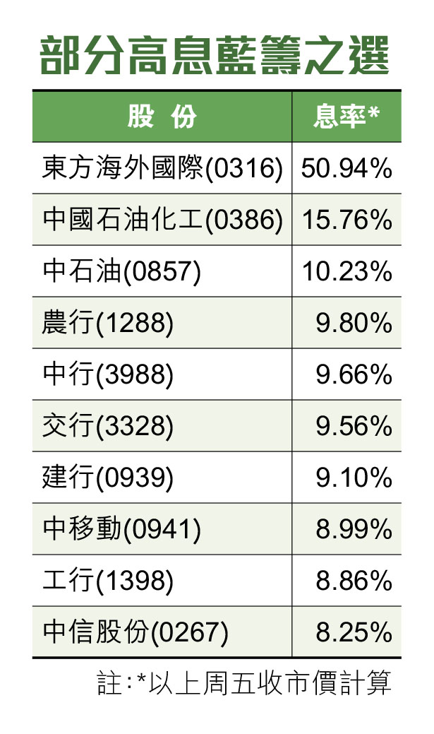 銀債逾百億資金回籠,趁着環球息口趨升,除了敘造高息港元定存外,如果老友記可接受一定風險、又想追求更高回報,亦可以考慮選擇投資高息藍籌股,以上周五(16日)收市價計,以東方海外國際(0316)股息率達50.94厘,冠絕一眾藍籌。另外尚有不少藍籌股息率都有9厘以上,回報有機會高過銀債保底4厘。