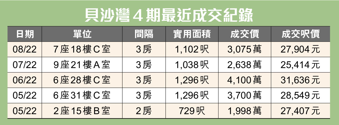 美聯物業南區數碼港分行高級營業經理陳子雄表示,由於近期樓市氣氛較差,影響到南區豪宅成交減少,貝沙灣今月至今只有兩宗成交,屬於1,000餘呎至1,100呎細三房套和工人套的細三房套單位,屬於屋苑的主流成交單位。而是次放盤單位則屬於1,300至1,400呎左右的大三房套單位。他並指,貝沙灣屬於南區樓齡較新及具備大型配套設施的屋苑,較受年輕買家歡迎。