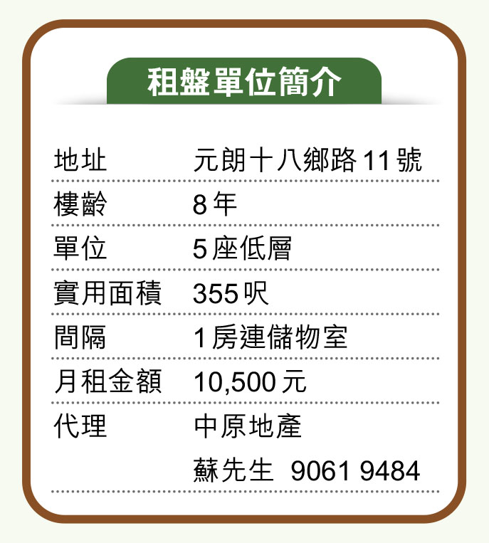 中原地產元朗尚悅二分行副分區營業經理蘇哲熙表示,是次放租單位實用面積355呎,間隔為一房連儲物室,望內園景。而同類放租單位共有5個,呎租平均11,000元。本月成交暫錄得6宗,平均成交呎租為32元。至於租客則以新婚夫婦、單身年輕人為主。