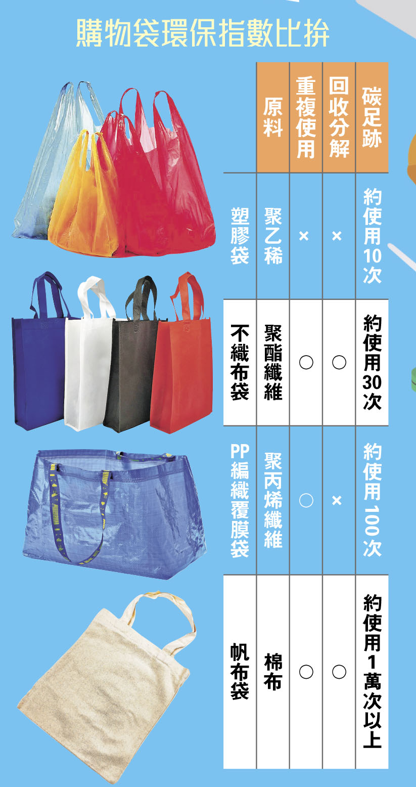 實踐減塑生活,一般人通常會從自備購物袋開始,但環保袋是否真的對環保有幫助,其中關鍵在於「是否有重複使用」。這些袋子從取得原料、製造生產,然後被使用過丟棄,還會經歷回收、焚化或堆肥,在這段期間所耗損的資源,拿來推算該重複使用幾次才能最環保。以帆布袋為例,根據丹麥研究顯示,要在重複使用將近1萬次的情況下,它的碳足跡才會降至與一次性塑膠袋相同。