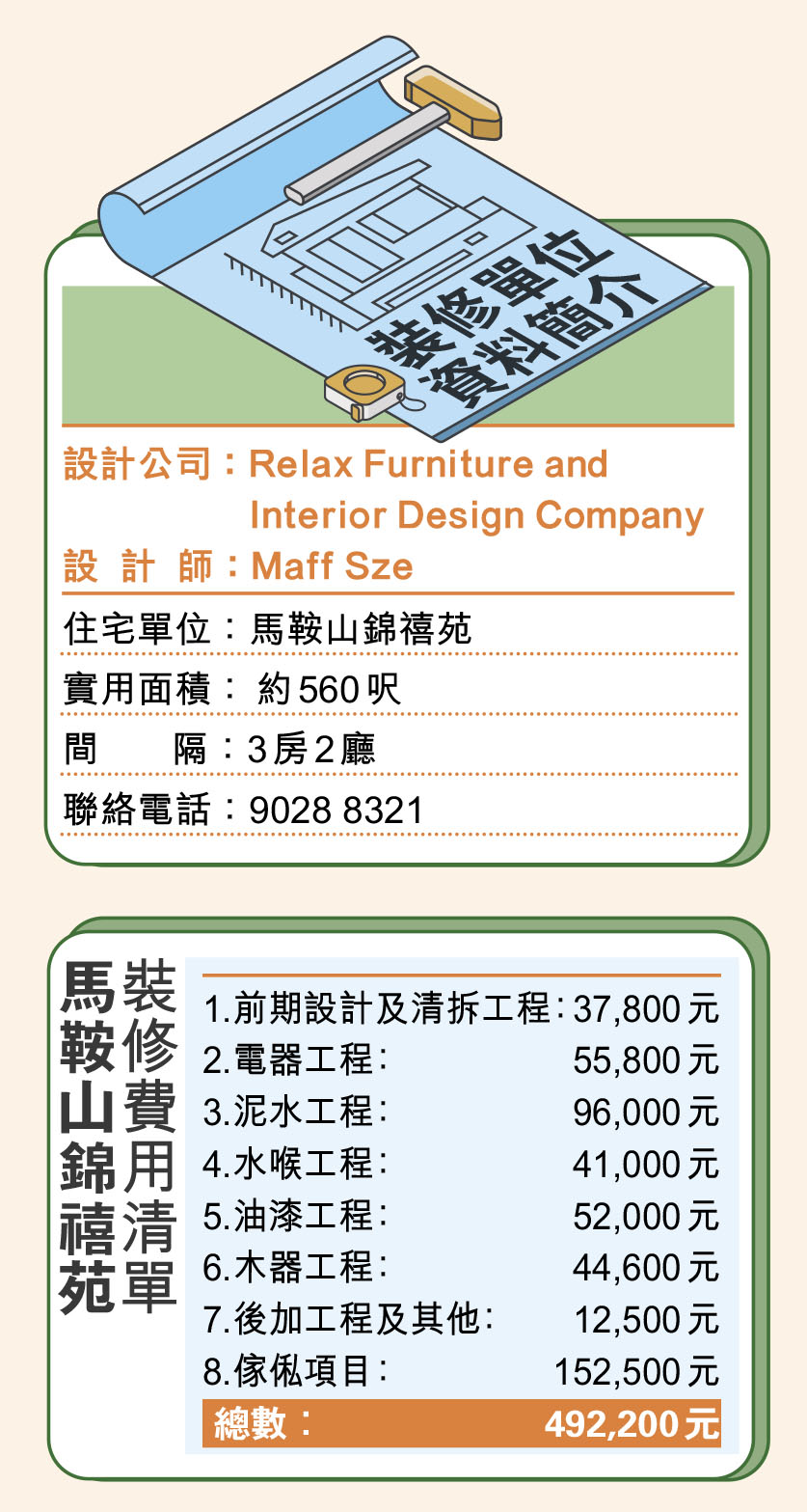 今次設計師Maff負責的馬鞍山錦禧苑室內裝修項目,由於樓齡超過20年,所以除了保留原有間隔外,其他可以更換的地方都換新了。包括所有水喉、電力裝置、鋁窗、地磚牆磚、連全屋油漆都重新髹上。