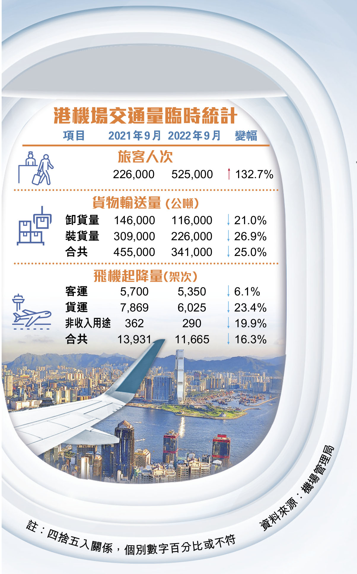 不過,上月貨運量和飛機起降量分別只有34.1萬公噸及11,665架次,與去年同月比較下跌25%及16.3%。機管局解釋,全球經濟前景不明朗、地緣政治局勢持續緊張,加上全球供應鏈受阻,均對貨運量造成影響,令出口及進口貨運量分別較去年同月下降30%及25%,往來北美及歐洲主要貿易地區的貨運量錄得最明顯跌幅。