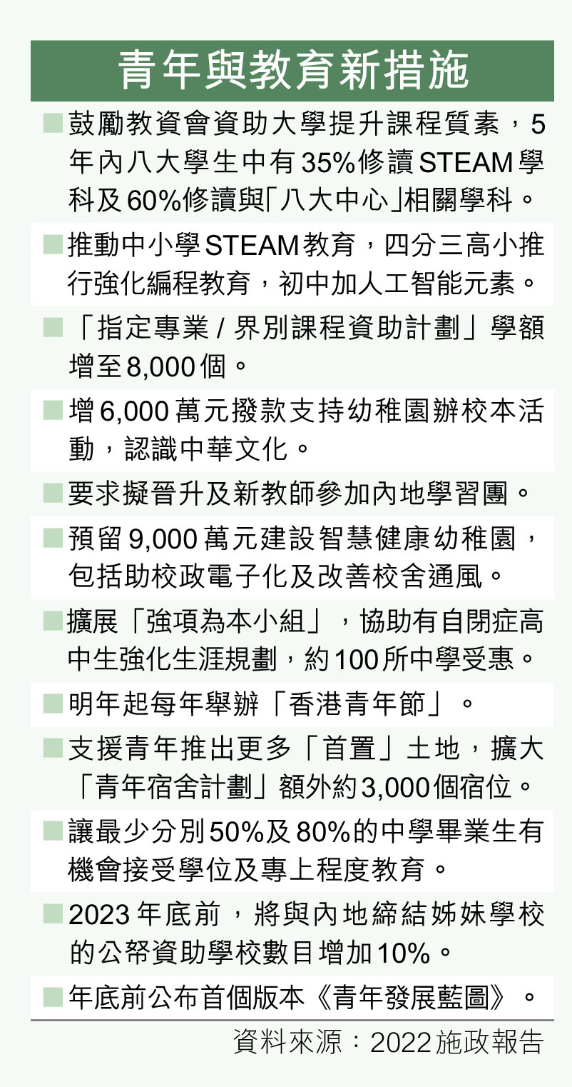 培養人才方面,政府已要求演藝學院重點研究為本地以至大灣區培育所需文化藝術人才,以及在「北部都會區」設立新校舍和增加非本地生比例。政府亦會展開不同文藝範疇的見習計劃,資助演藝學院或大學文藝課程的學生到藝團和西九文化區實習,同時增加資源扶植和培育有潛質的年輕藝團和藝術家。