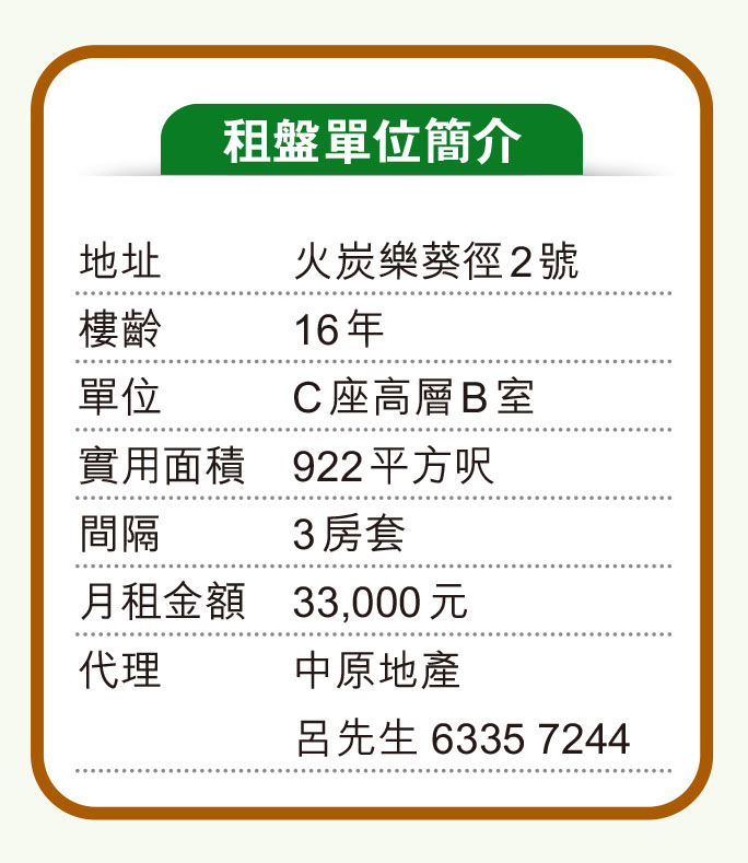 屋苑間隔分為2房、3房、3房連套房、4房連套房、4房雙套房、相連單位以及5房雙套房連空中花園的特色單位,選擇甚多。面積方面,標準單位的面積由約800平方呎至約2,100平方呎不等,複式單位面積約2,300平方呎,特色單位命名為「星級寶藏」,面積則約3,000平方呎。