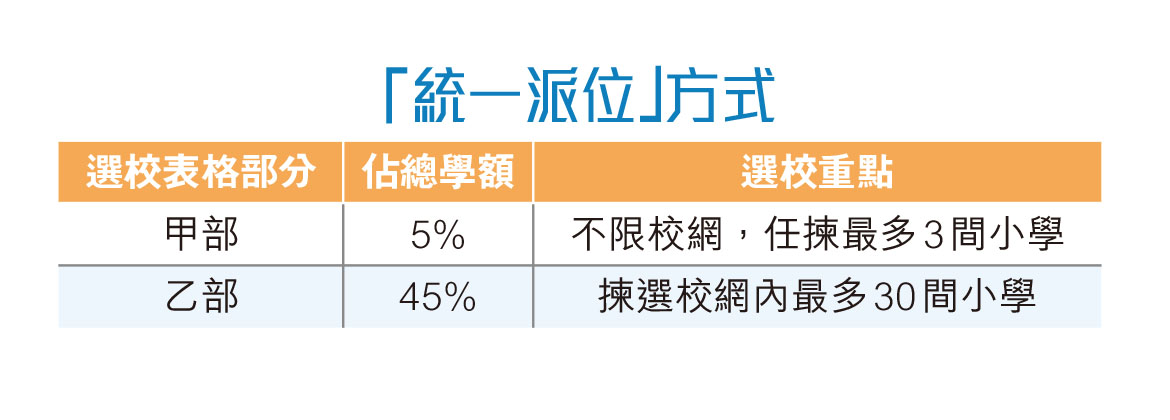 未獲取錄的學童家長,須於明年2月4日至5日為子女辦理「統一派位」選校手續,填寫《選擇學校表格》。此時最好帶同所需筆記,避免臨場才思考排序。此階段的學童會被隨機編排一個號碼,號碼愈前,愈早派位,獲派心儀學校的機會就愈高。家長若在明年1月30日前仍未收到選校通知書,應盡快致電學位分配組(2832 7700)查詢。「統一派位」結果將於明年6月7日至8日透過郵寄方式,上門派遞給家長。家長亦可選擇透過電話短訊(SMS)接收結果。家長須在指定期間前往獲派的小學為子女辦理註冊手續。「統一派位」分為兩部分,會先按甲部派位,甲部未獲取錄便落入乙部派位。其後,家長須攜同註冊證到被獲派的學校辦理入學手續。