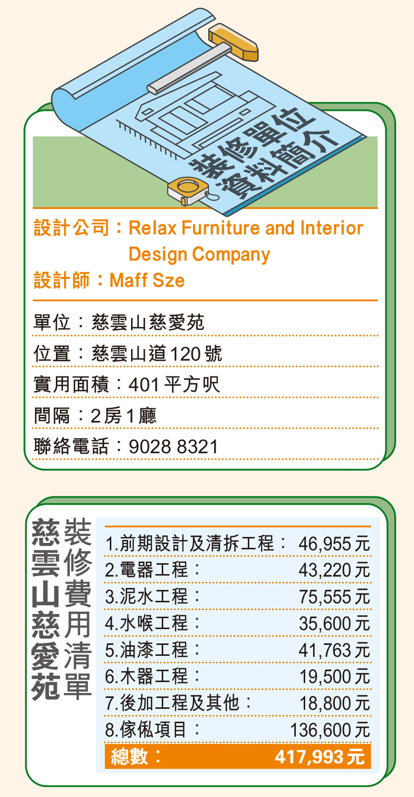 是次慈雲山居屋慈愛苑裝修單位的屋主喜歡簡約溫和風格,設計上不用太浮誇但要有重點。首先,在間隔上,原則女兒睡房房門正在電視牆的中間,為了讓客廳可以設置電視櫃,所以作出改動,將房門改到近窗一邊。客廳間隔得以改善,連帶飯廳空間亦增加,除可放置四人飯枱外,亦可造高身儲物櫃。另外,睡房房門都用上趟門,既慳位又易打理,睡房簡單訂造地台床、衣櫃及收納櫃,儲物位置充足,讓空間更鬆動。