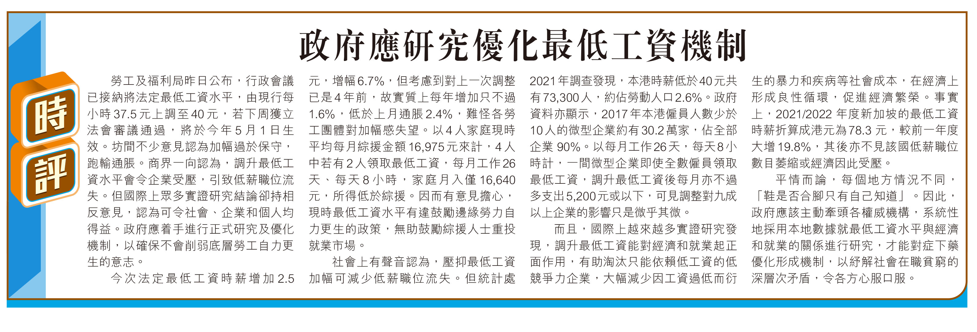 【時評】政府應研究優化最低工資機制