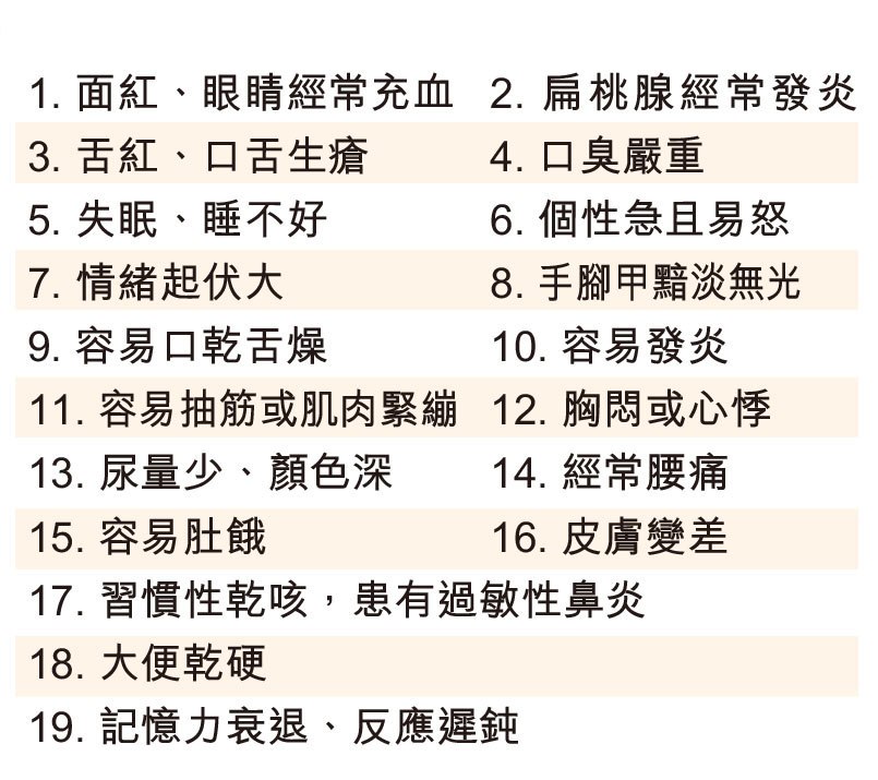 缺陽氣雖不至於立即生病,但當流失到可觀的量會致病。與其等到生病求醫,倒不如缺陽氣前就盡快補充。以下缺陽氣徵兆,如果符合五項以上,很可能體內已缺陽氣。不想體質變寒,切記不要多食寒涼,以免破壞自身的陽氣(見表)。