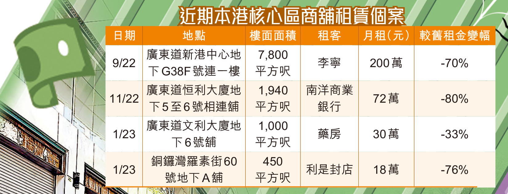 溫運強指出,上季四大商業區中環、銅鑼灣、旺角、尖沙咀空置率分別為8%、14.5%、17.1%及20.3%。持續多年的疫情,令尖沙咀、旺角及銅鑼灣等街舖市道非常嚴峻,「天價」街舖不再!例如曾為全球最貴舖租街道的銅鑼灣羅素街疫情前平均每月呎租約1,500元,目前租金已大跌45%至約825元;戴德梁行報告亦顯示,現時全球最貴舖租的尖沙咀廣東道,2022年舖位年平均每月呎租933元,租金對比疫情前跌41%。