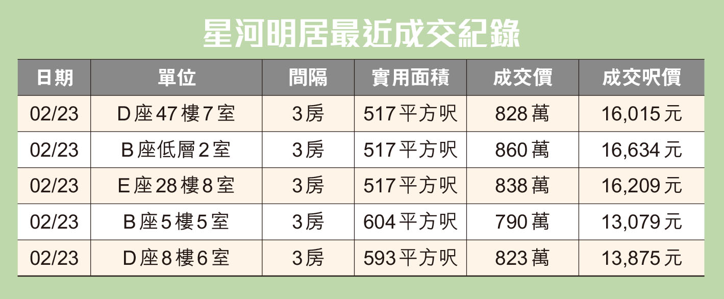 美聯物業鑽石山星河明居分行高級客戶經理黎志榮表示,星河明居現時放盤約有50個,平均叫價約16,600元至18,600元不等。是次放盤單位屬B座高層3房單位,向東南、望開揚內園景。
