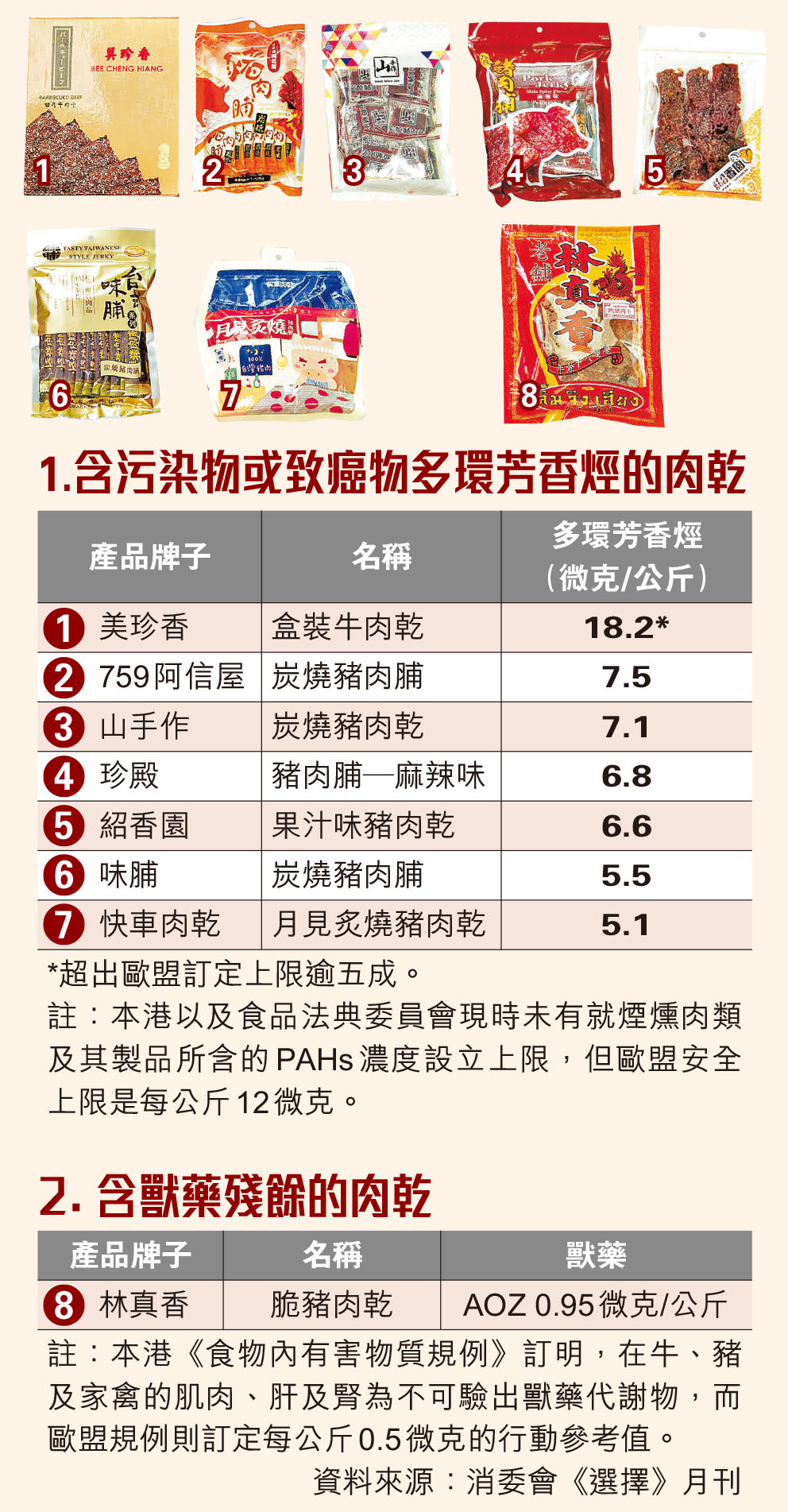 消委會昨舉行記者會公布測試結果,在30款樣本中,13款驗出PAHs,包括9款豬肉乾和4款牛肉乾,分別為「黑橋牌」、「快車肉乾」等,其中「美珍香」盒裝牛肉乾含量最高,為每公斤18.2微克,超出歐盟上限逾五成。PAHs是可致癌污染物,雖然本港以及食品法典委員會現時未有就煙燻肉類及其製品所含PAHs濃度設上限,但歐盟就訂定每公斤12微克的上限,有研究顯示若每天食用50克加工肉製品,患上大腸癌風險會增加18%。