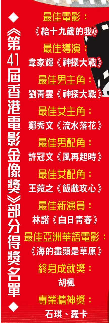《第41屆香港電影金像獎》昨晚假文化中心舉行,鄭秀文(Sammi)憑《流水落花》第十次角逐金像獎「最佳女主角」,昨晚她終於順利捧走影后寶座;劉青雲就憑《神探大戰》第三度榮膺金像影帝。紀錄片《給十九歲的我》因未獲部分主角同意公映引起軒然大波,但仍奪得「最佳電影」,導演張婉婷未有上台,由聯合導演郭偉倫代張婉婷讀出致辭。