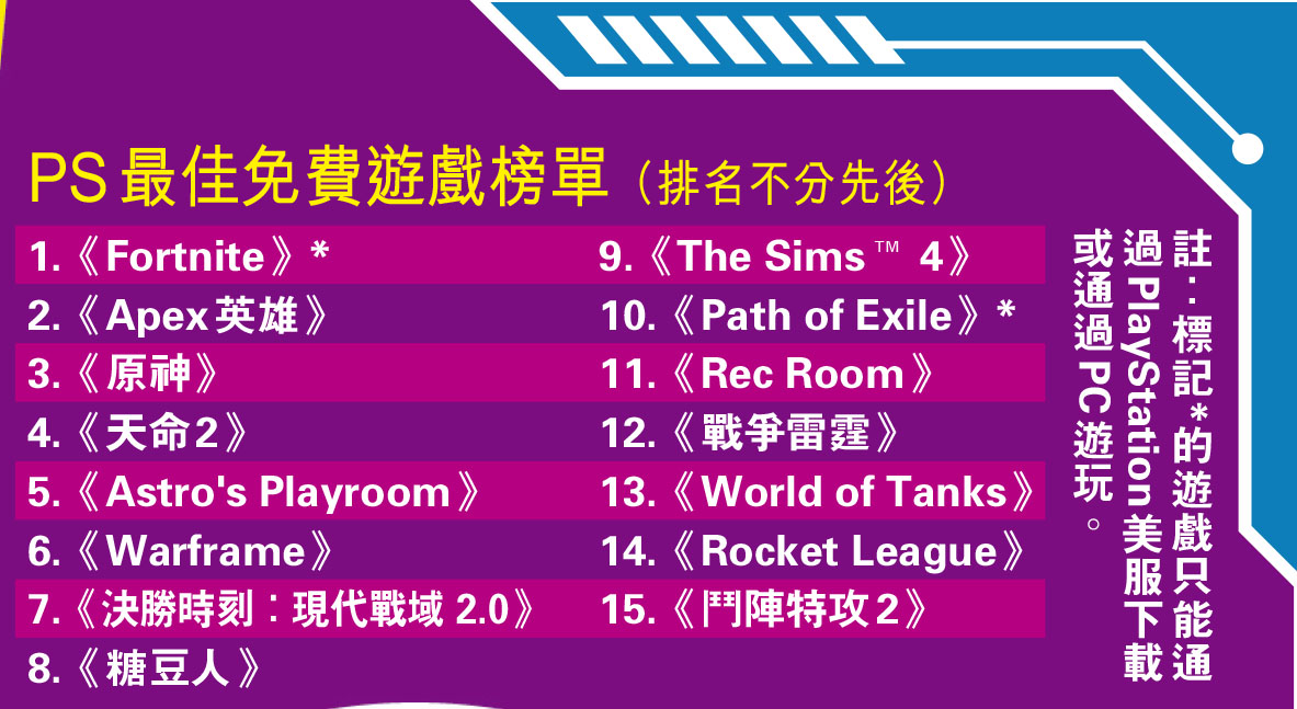 不需要付款便能永久體驗遊戲主要內容的免費遊戲,近年來成為市場的一大趨勢,也吸引了大批玩家,但數量繁多難免令人眼花繚亂、選擇困難。國際遊戲評論網站Image Games Network(IGN)近期盤點了15款PlayStation平台上的最佳免費遊戲,其中不乏我們之前已經討論過的《Apex英雄》、《原神》、《鬥陣特攻2》等,不妨來了解下你玩過哪些,又有哪些感興趣的?