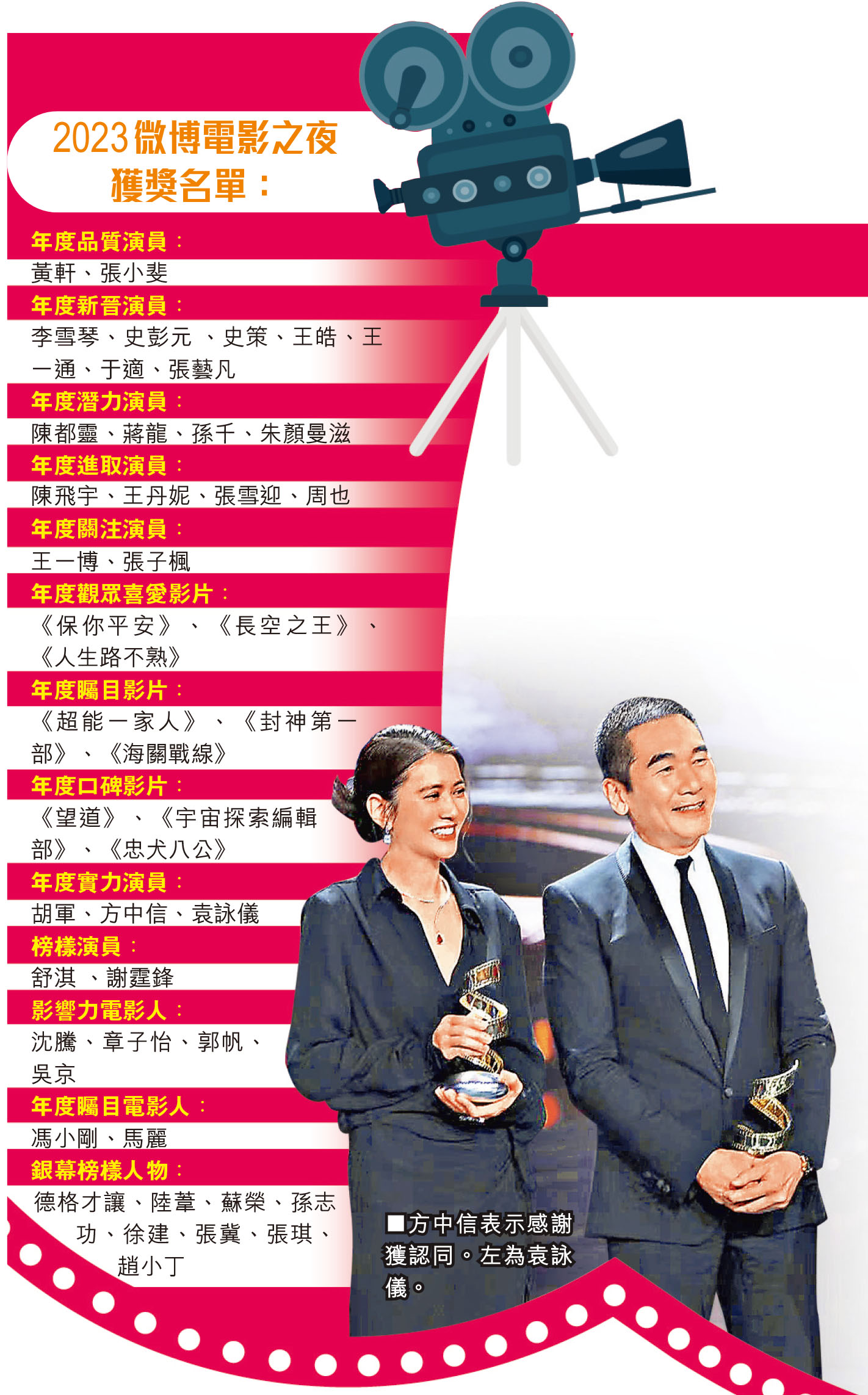 方中信、袁詠儀當晚齊獲頒「年度實力演員」獎項。從影多年的方中信以往亦獲得「第五屆華語電影傳媒大獎影帝」、更獲提名香港電影金像獎最佳男主角,演技早已獲得認同。這次獲獎,方中信表示:「感謝2023微博電影之夜對我的認同和頒這個獎給我。」獲獎後不少圈中友好也予以祝賀,並同時祝賀他有份參與的電影《別叫我「賭神」》獲得「年度特別推薦影片」。現時方中信正忙於拍攝多部電影,而《金手指》、《掃毒3人在天涯》等他有份主演的電影亦將陸續上映。值得一提的是,周潤發一身休閒裝領銜《別叫我「賭神」》劇組亮相,被網友打趣「周潤發是跑完直接來的嗎?」被問及在電影圈好人緣的秘訣時,周潤發滿臉笑意:「永遠年輕,永遠18歲。」
