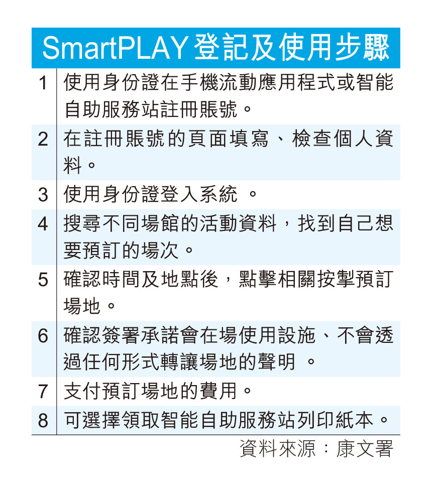 康文署昨介紹全新的康體服務預訂系統「SmartPLAY」,包括互聯網、流動應用程式及智能自助服務站。新系統將於下月3日開放予用戶登記,該署轄下200多個康樂場地已經陸續安裝全新的智能自助服務站,市民只需要將身份證放在掃描器2至3秒,系統就會顯示個人資料,再填妥聲明即可成功登記個人賬戶,現有「康體通」用戶必須重新登記。
