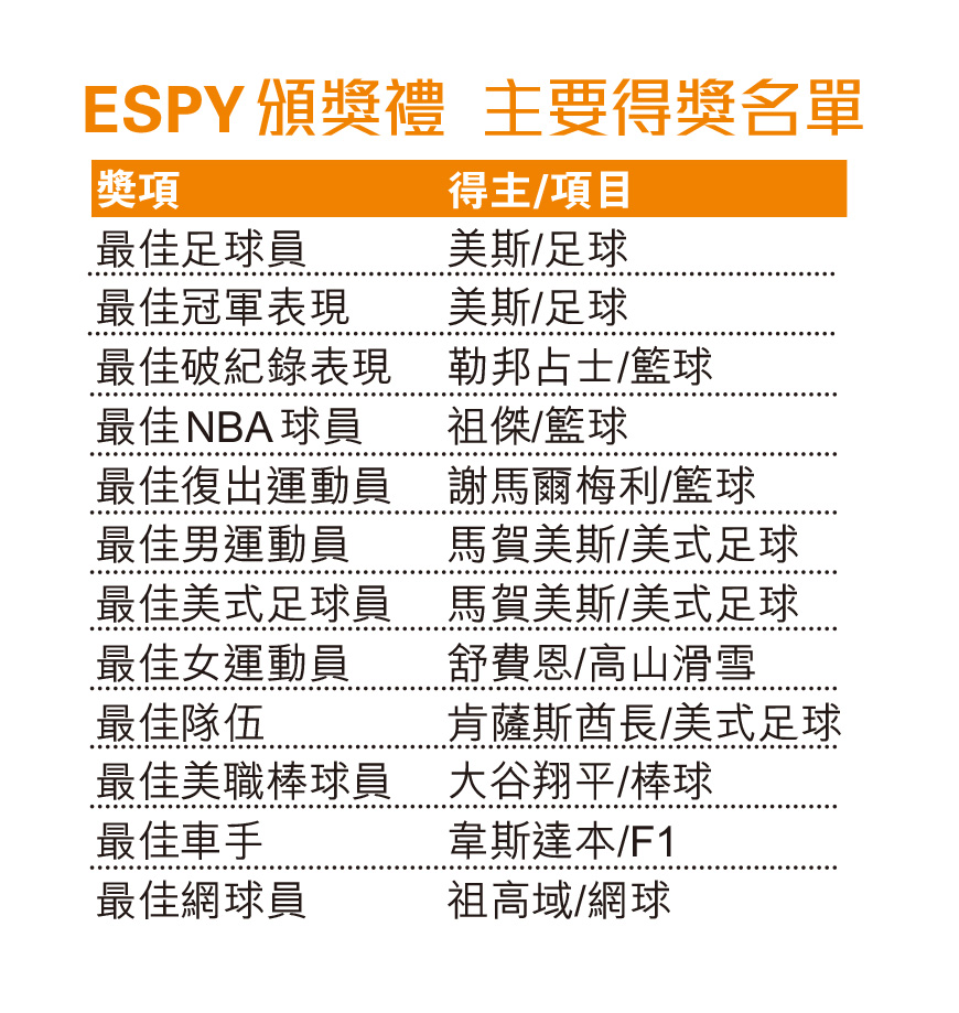 雖說是個關於全球體壇的頒獎禮,但美國主流運動自然格外受重視,其中NBA球星包括祖傑便獲得了年度NBA最佳球員獎,其金塊隊友謝馬爾梅利亦得到最佳復出運動員獎,而「大帝」勒邦占士則憑其打破了「天勾」渣巴的NBA史上得分紀錄的表現,得到最佳破紀錄表現大獎,絕對是實至名歸。